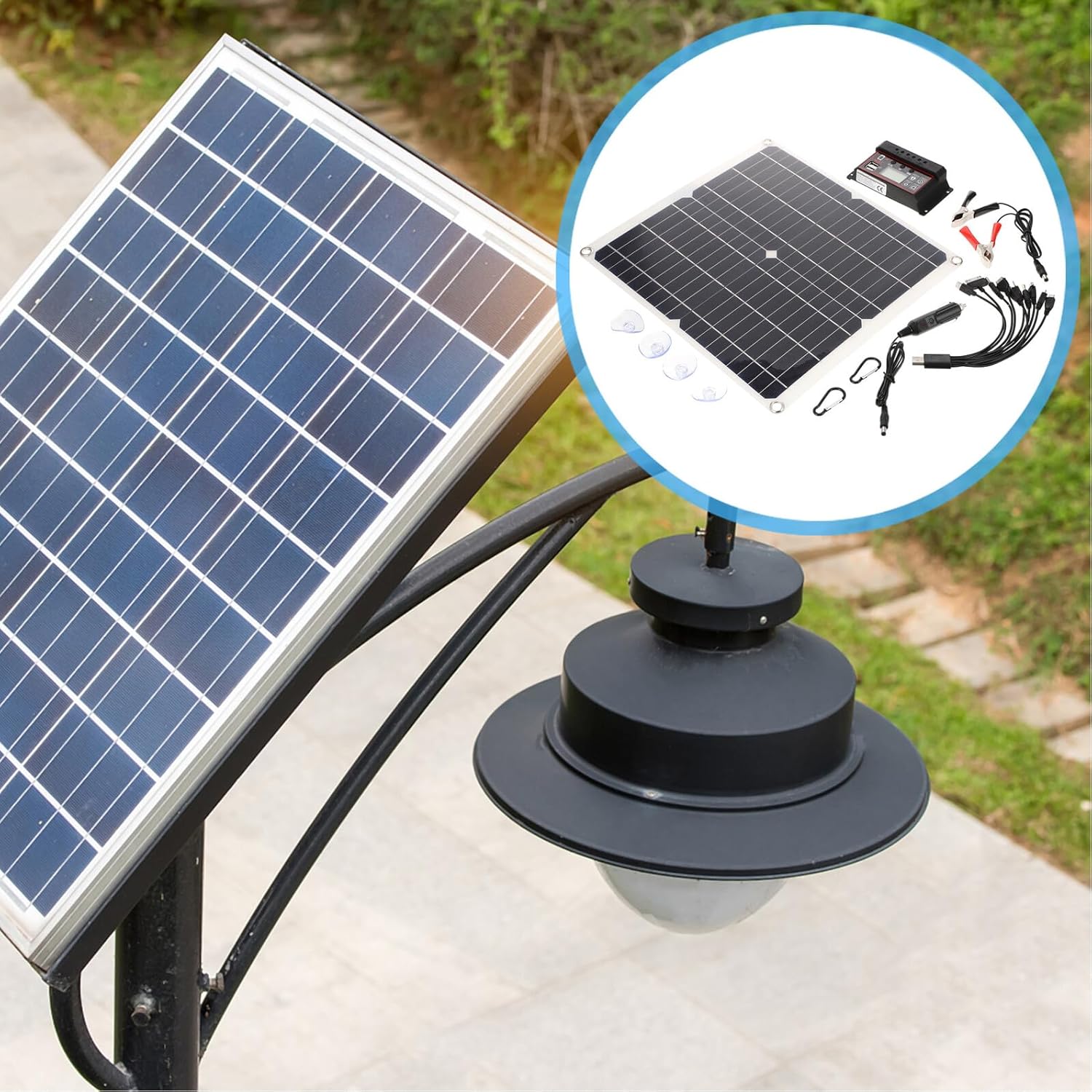 Package List 4 x suction cups 1 x charger 1 clip 1 x solar panel 2 x carabiners 1 converter 1 x USB power cord Characteristics -Open circuit voltage: 20 (V) solar panel charging kit. -Material: Single Crystal. -Working current: 1.5A (A). -Size: About 36.00X33.00X1.70cm/14.15X12.97X0.67inch. -Maximum power: 25 (W). -Short-circuit current: 1.8 (A). -Product Info:Solar panels -Working voltage: 18 (V). -System voltage: 18 (V). -Color: Assorted Color. -It can help most devices to charge and has an excellent emergency response effect solar charging panel. -The output efficiency is good, the applicability is strong, and it can well meet your needs solar power kit. -It is made with excellent technology, high conversion efficiency, and environmental protection. -With simple application and operation methods, it can bring you more convenience. -Suitable for outdoor cycling, mountaineering, hiking, camping, travel and other activities to carry, very convenient and practical.Goods Descriptionsolar panel is made of excellent craftsmanship, has good working performance, is easy to carry, and is simple to use.solar panel charging kit It is a very good outdoor charging device.solar charging will be your good choice.solar power kit The solar panel charger is mainly made of monocrystalline materials, safe and durable, with excellent texture, and can play an excellent emergency response