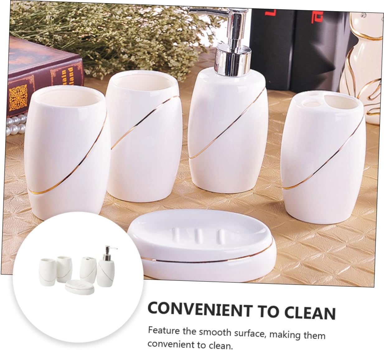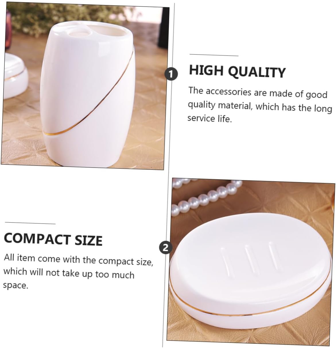 Package List 1 x sub bottle 1 x toothbrush rack 1 x soap plate 2 x gargle cups Characteristics - Packaging size: About 34x24x11cm/13.4x9.4x4.3inch Toothbrush Holder - Material: Ceramics Sanitary Accessory - Color: White Bathroom Washing Accessory - Ceramic material offers you smooth surface, very convenient to clean Toothbrush Rack. - They are designed to keep them clean and tidy Tumbler. - to store toothpaste, toothbrush, and your soap and lotion Personal Washing Cup. - and material makes it come with hard structure and portable Container. - Suitable for the use Toothbrush Storage Rack.Goods InformationToothbrush Rack This product is a set of bathroom sanitary accessories, it includes two gargle cups, one lotion bottle, one toothbrush rack and a soap tray, which are made from material for and long-lasting use.Toothbrush Holder It is for hotel or home use.Container Ceramic material offers you smooth surface, very convenient to clean