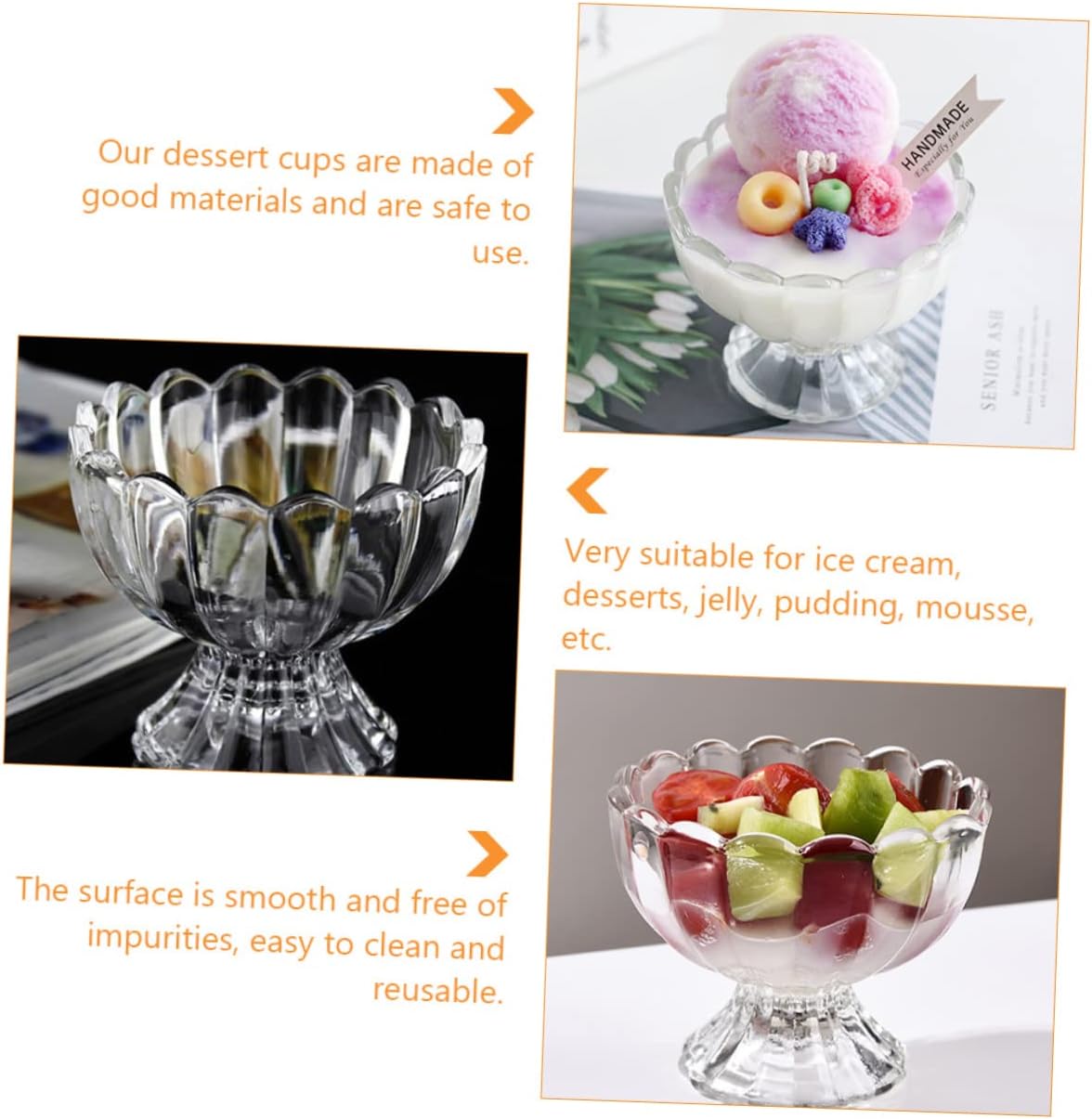 Package List 6 x Cups Characteristics -Capacity: 100ml Dessert Container. -Color: Transparent small clear cups. -Size: About 9.00X9.00X7.50cm/ 3.54X3.54X2.95in pudding cup. -Material: Glass Dessert Bowl. - They have a wide range of uses, including ice cream cups, pudding cups and dessert cups small cups for dessert. - The design is simple and conforms to the public aesthetics Dessert Cup. - A cups can meet your daily needs ice cream cups. - Made of glass material, resistant to cold and heat clear . - Share these cups with your family because they are practical clear fruit bowl.Goods Descriptioncups ice cream bowls They can be used to hold ice cream, fruits, salads and other things.dessert serving bowls They can be used not only , but also at parties.footed ice cream bowl Are you still worried about finding suitable cups? Our cups are made of glass, which is and
