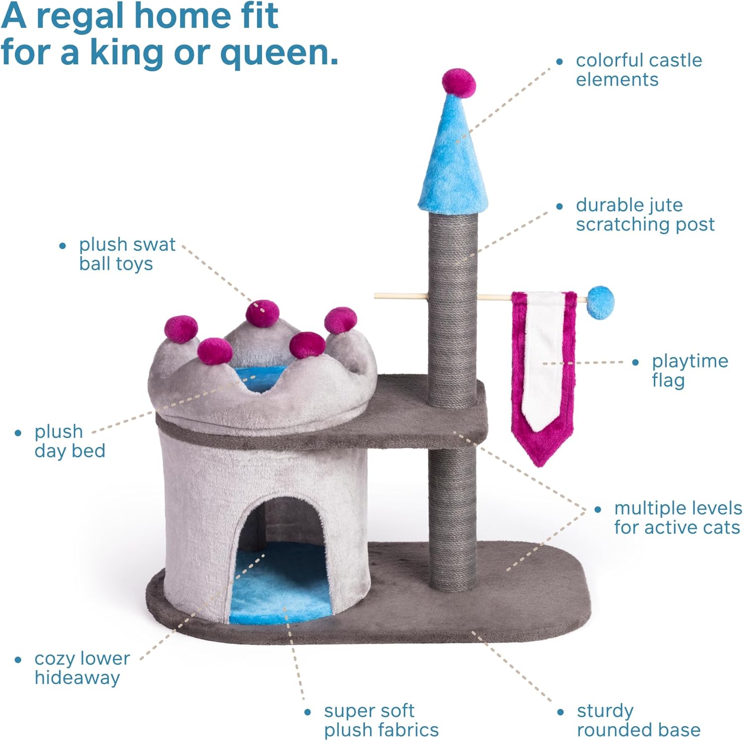 Model Number: 7350 Product UPC Number: 048081073506 New Item! Large cozy day bed with plush bumpers Jumping terrace Jute scratching posts for healthy paw exercise Pull-out flag for playtime fun Cozy hideaway with breathable fabric Soft fabrics Description Additional Information Assembly Sheets Prevue Pet Products King’s Manor 7350 combines super soft, plush fabrics with durable jute posts to give your cat the royal treatment! A velvety soft pillow sitting atop a castle provides the perfect place for your cat to sleep, lounge and survey their kingdom! Watch your kitty engage in energetic activity – playing with the hanging flag and plush pom poms. The jute rope scratching posts offer an appealing texture to cats, curbing inappropriate scratching behaviors and saving your sofa. This plush cat furniture encourages exercise as your cat scratches, stretches, grooms nails and strengthens their paws. The lower-level cozy hideaway provides a designated space to relax. Our whimsical King’s Manor adds a regal presence to any room! In gray, light blue an bold shades of fuchsia this multi-level, multi-purpose cat tower that is sure to delight. Measures 28 3/4" L x 16" W x 34 1/2" H. Inner Pack 1 Unit of Sale EA Overall Size 28 3/4" L x 16" W x 34 1/2" H