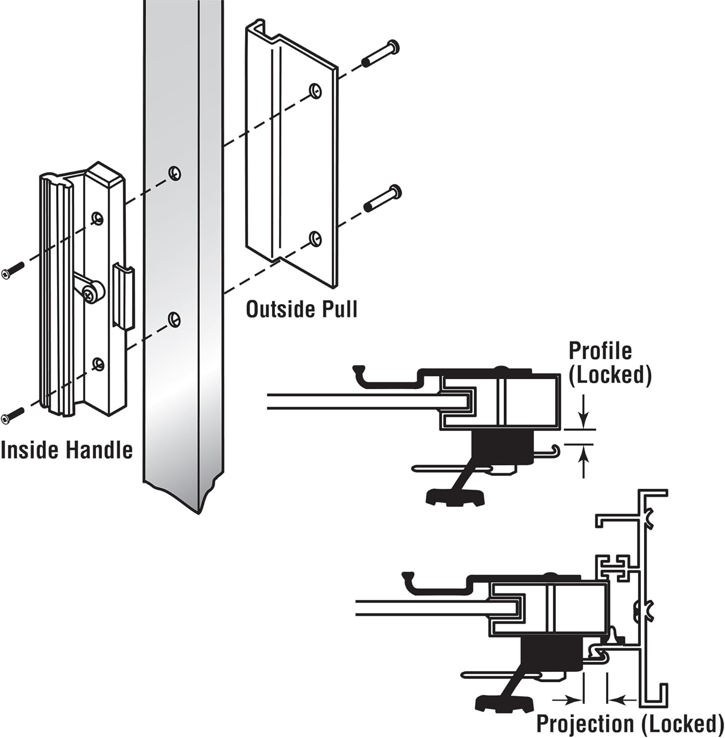 Product Description This is an upgrade from the typical clamp handles. The inside handle has a wood handle attached to a black bracket and has a height of 2 inch from the door frame. The outside handle is black diecast. The clamp latch has a clamp profile of 1/4 inch and a clamp projection of 1/2 inch in the locked position. The handle has 4-15/16 inch on center mounting holes. It is non-handed and can be used on right or left-handed doors. It is non-keyed. Order Prime-Line part E 2000 to key this unit. Minimum door width of 7/8 inch and maximum of 1 inch From the Manufacturer This patio door clamp-style handle set is constructed of an extruded aluminum, and wooden pull inside handle, with a diecast-constructed outside pull that fits 4-15/16 in. mounting hole centers. It is a surface mount application that does not require nor include a keeper, as it's clamp reaches for, and engages onto the extruded metal framework. This handle set features a 1/4 inch profile and a 1/2 inch reach.