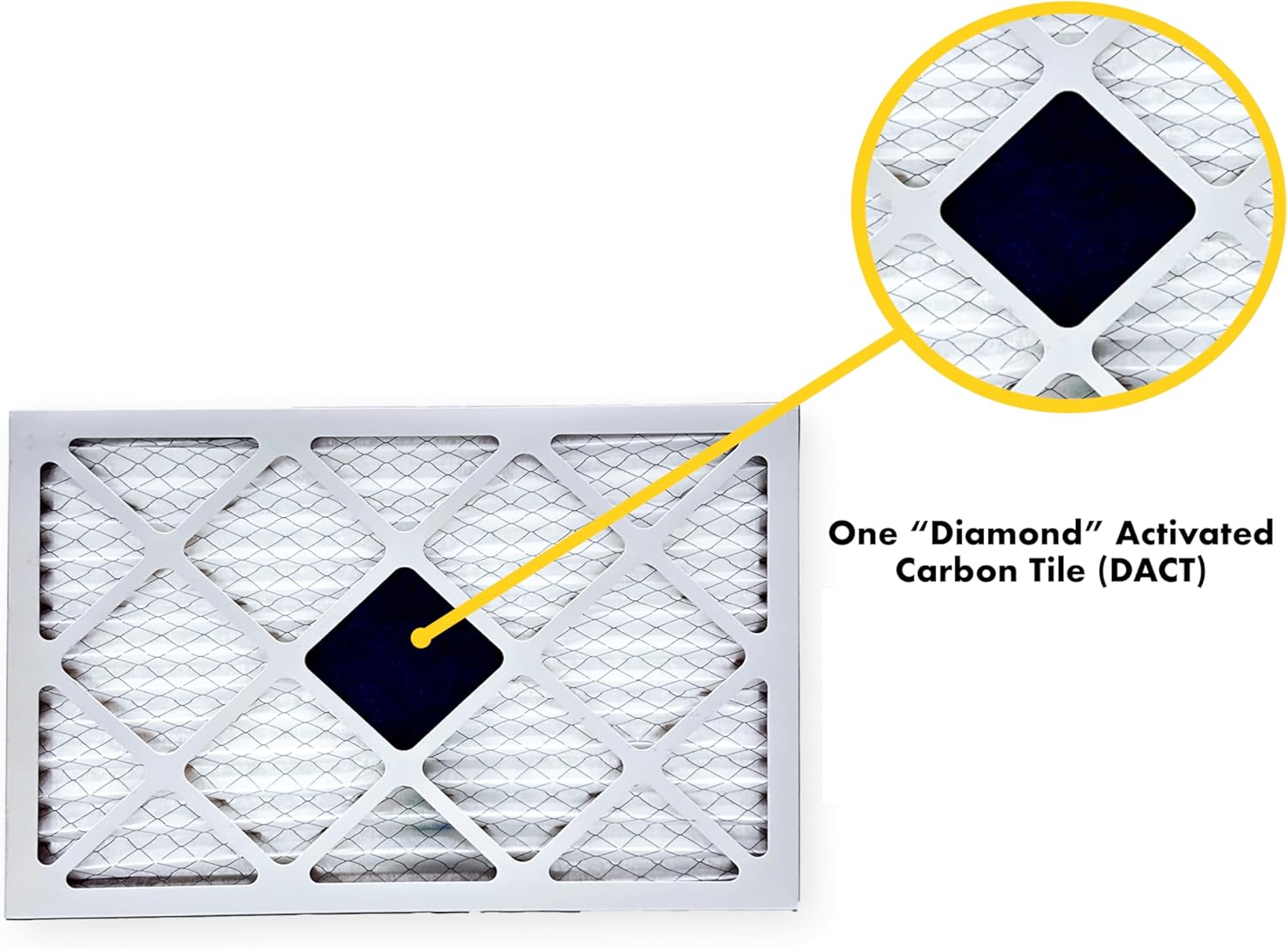 Proairtek 14x20x1 Air Filter MERV 8 with One "Diamond" Activated Carbon Tile to Neutralize Odors ensures clean, odor-free air for your home or business. This filter also features an activated carbon layer to neutralize household odors. Its durable electrostatically charged pleated design improves airflow efficiency and lasts three times longer than standard fiberglass filters. Built with an industrial-grade beverage board frame, it resists moisture and high temperatures for enhanced structural integrity. Manufactured in the USA using recyclable materials, this filter offers an eco-friendly solution to maintaining superior indoor air quality In a typical residential HVAC system, the air should circulate through the entire home about 2-3 times per hour. This is often referred to as "air changes per hour" (ACH). The "Diamond" Tile Activated carbon tile gradually eliminates odors without clogging the Air Conditioner air flow. This small carbon tile allows the filter to be changed less frequently than filters that have a full size layer of carbon fibers, while allowing the gradual elimination of odors Features: - Pack of 6 filters - Neutralizes odors with activated carbon technology - Durable pleated design for extended use - Resists moisture and high temperatures - One "Diamond" Activated Carbon Tile (DACT) gradually eliminates odors without clogging the Air Conditioner air flow Specifications: - Unit Dimensions: 14 x 20 x 1 Inches - Unit Weight: 0.29 Pounds - Shipping Dimensions: 14 x 20 x 6 Inches - Shipping Weight: 1.74 Pounds
