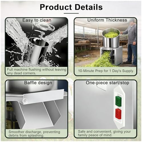 Are you looking to streamline your vegetable preparation process? Our Commercial Vegetable Dicer Chopper is the perfect solution for efficiently preparing nutritious feed for your poultry and livestock. This versatile machine is designed for both home and farm use, making it ideal for anyone who wants to save time while ensuring their animals receive the best possible meals. **Key Features:** - **High Chopping Capacity:** Process between 60-200 kg of vegetables per hour, making it suitable for both small and large-scale operations. - **Powerful Motor:** Equipped with a high-performance brushless motor operating at 3500 RPM, this chopper ensures consistent and reliable performance. - **User-Friendly Design:** The enlarged feed inlet accommodates larger quantities, while the straightforward one-piece start/stop function makes operation simple and hassle-free. - **Durable Construction:** Crafted from high-hardness titanium alloy blades and a robust 304 stainless steel body, this chopper is built to last. - **Easy to Clean:** All detachable parts facilitate quick cleaning, ensuring hygiene and maintenance are effortless. - **Versatile Applications:** Not only suitable for chopping vegetables, but it also works well with fruits, catering to a variety of feeding needs. **Product Specifications:** - **Name:** Commercial Vegetable Chopper - **Color:** Silver - **Voltage Options:** 110V (60Hz) / 220V (50Hz) - **Power Options:** 1000W / 1200W / 1500W / 1800W - **Speed:** 3500 RPM - **Material:** Thickened 304 stainless steel - **Blade Material:** Titanium alloy manganese steel - **Output:** 60–120 kg/hour - **Chopping Coarseness:** Adjustable - **Dimensions:** 30 x 30 x 55 cm - **Weight:** 10 kg - **Uses:** Ideal for chopping vegetables and fruits for poultry feed. **Package Includes:** - 1 Professional Chopper - 4 Titanium Alloy Blades - 1 Stainless Steel Splash Lid - 1 Cleaning Wooden Spatula We are dedicated to providing high-quality products and excellent cust...
