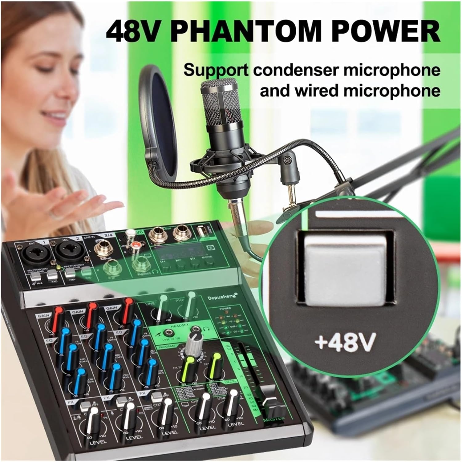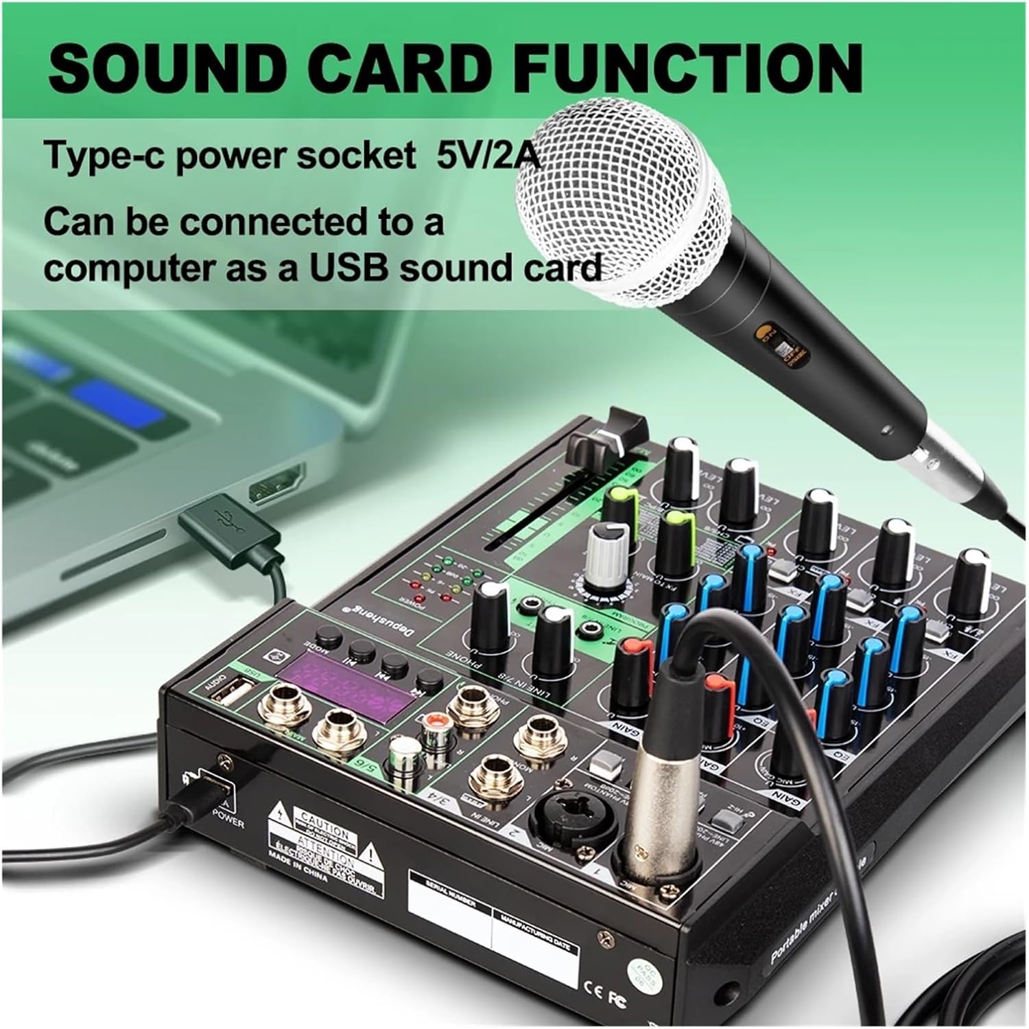 This mixer is a small and powerful mixer, which can meet the needs oflife, small concerts, family musicproduction, cover, network live / and other occasions.1/2-channel microphone balanced input, bult-in large dynamic, low noise microphone amplifier. And the -20dbattenuation function is configured, 3 /4-channel stereo channelinput.The channel high and low 3-stage parametric equalizer.FX independent control effect switch.16 kinds of digital audio effectors with 24bit DSP are bullt in. The first channel has Hi-zconnector with high impedance transformatlon, which makes it convenient for users to connect electronic equipment such aselectric guitar, The main output is 60mm high precision level attenuation thruster, Tap s input 5/6 control.3.5 the livecapacitance ofthe socket is controlled by 7/8, and other electronic equipment can be connected, The monitor room is outputindependently, and there are 6.35mm and 3.5mm headphone monitoring seats respectively.Signal distortion monitoring lamp, 4-stage level monitoring, Provide 48V phantom power supply. LCD display supports lossless playback /computerbidirectional recording /one-way recording, which can be conveted to recelving and playing, 5Vpower adapter. It can be powered by port ofcomputerPackage list:Mixer console *1Power cable *1Manual *1Chip protection, overvoltage undervoltage overheat DC short circuit detection.
