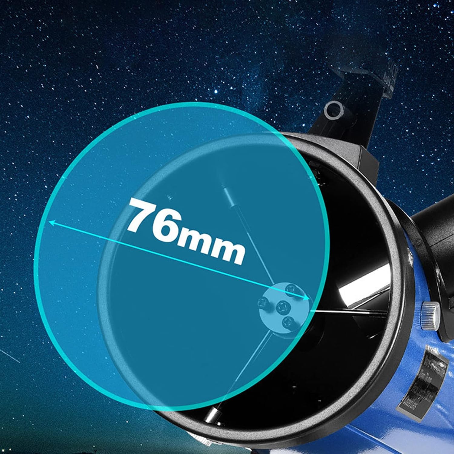 The telescope is an excellent gift for children-it will make children have a strong interest in science and prevent children from indulging in the world of games. The high-definition astronomical telescope is very suitable for beginners to explore the vast sky, such as the moon, planets, star clusters and fog. At the same time, you can watch endless landscapes, mountains and rivers, flowers and birds, and animals. SPECIFICATION: Objective lens diameter: 76mm Focal length of primary lens: 700mm Magnification: 28-210 times Focus ratio: 9.2 Limit magnitude: 11 Gathering power: 118X Resolving power: 1.6 Optical system: reflective Eyepiece: K10mm/K25mm and 3X Barlow teleconverter Star finder: plug-in red dot star finder Zenith Mirror: 45° Erect Image Zenith Mirror Tripod: aluminum alloy retractable tripod (about 60-140cm in height) PACKAGE CONTENTS: 1 * Tripod 1 * Main tube 2 * K10mm eyepiece/K25mm eyepiece 1 * 3X Barlow teleconverter 1 * Moon mirror 1 * Wrench 1 * Bluetooth controller 1 * Mobile phone holder 1 * Star finder 1 * Storage tray 1 * Constellation map Warning: Do not look directly at the sun through the telescope, as this may cause irreparable damage to your eyes.