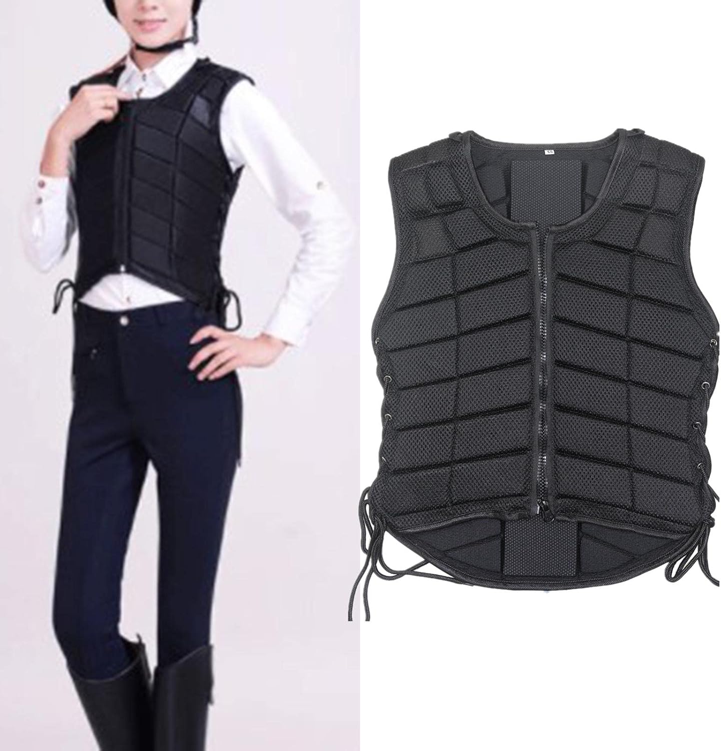Description: - Safety breathable vest combines optimum comfort and fit while affording a high level of shock absorption and impact reduction - The zippered front and laced side adjustment provides an easier fit - Lower front allows less restriction - Extended padding provides increased protection for the tail bone - Professional horse riding equestrian body protector for toddler kids, children, youth ,women and men.Specification: - Material: EVA - Color: BlackSize Chart:For Children:S: Front length: 22cm, back length: 38cm, bust: 63cm. Suitable height: 110-120cm, weight: 15-18kgM: Front length: 26cm, back length: 41.5cm, bust: 63-68cm. Suitable height: 120-135cm, weight: 19-25kgL: Front length: 30cm, back length: 46cm, bust: 68-74cm. Suitable height: 135-150cm, weight: 25-35kgFor Adults:S: Front length: 30cm, back length: 51cm, bust: 78cm. Suitable height: 150-163cm, weight: 36-55kgM: Front length: 35cm, back length: 56.5cm, bust: 83cm. Suitable height: 163-170cm, weight: 55-65kgL: Front length: 38cm, back length: 63cm, bust: 89cm. Suitable height: 170-175cm, weight: 65-75kgXL: Front length: 38cm, back length: 65cm, bust: 95cm. Suitable height: 175-180cm, weight: 75-85kgXXL: Front length: 41cm, back length: 70.5cm, bust: 102cm. Suitable height: 180-190cm, weight: 85-95kg(1cm≈0.39inch, 1kg≈2.2lb)Package Includes:1 Piece Equestrian Vest:Please allow slightly measuring deviation due to manual measurement.