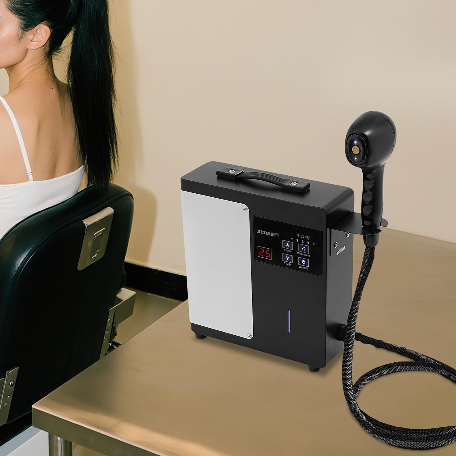 Our hair steamer adopts the nano spray technology, which can deeply nourish hair and effectively improve hair quality. The display screen design makes the operation more intuitive and convenient, and you can easily adjust the appropriate care time and fog output for yourself. Its lightweight and portable body makes it very convenient for both home use and travel.SpecificationMaterial: Hard Sheet Metal, IronColor: Black, WhiteProcess: Sandblasting, Baking PaintStyle: ModernInstallation Type: TabletopPlug Type: US StandardTotal Power: 1250WInput Voltage: 110V 60Hz 12AWater Bottle Capacity: 500ml/16.91ozRange of Fog Output: 12-33ml/0.41-1.12oz/minMist Spraying Distance: 70-250cm/27.56-98.43inFog Output Gears: 5Adjustable Time Range: 1-60 MinOperation Panel: Full Touch Digital DisplayInternal Heater Operating Temperature Range: 100-190 ℃/212-374℉Power Cord Length: 1.8m/5.91 ftProduct Size: 28*10*30cm/11.02*3.94*11.81inSpray Gun Length: 22cm/8.66inPackage Size: 38*36*17cm/14.96*14.17*6.69inGross Weight: 4kg/8.82 lbsNet Weight: 3.8kg/8.38 lbsPackage Included1* Hair Steamer1* Water Bottle1* Power Cord1* English ManualOther Accessories for UseNotes1.Please read the operating manual and labels completely before use, and pay particular attention to the safety instructions included.2.Please note that the temperature of the sprayed steam varies depending on the distance and the perceived temperature. For example, the temperature at the nozzle can reach194℉, and at a distance of 11.81in from the nozzle, the perceived temperature isabout 140℉. The farther the distance, the lower the temperature. Suggest using 11.81-19.69in away from the nozzle.