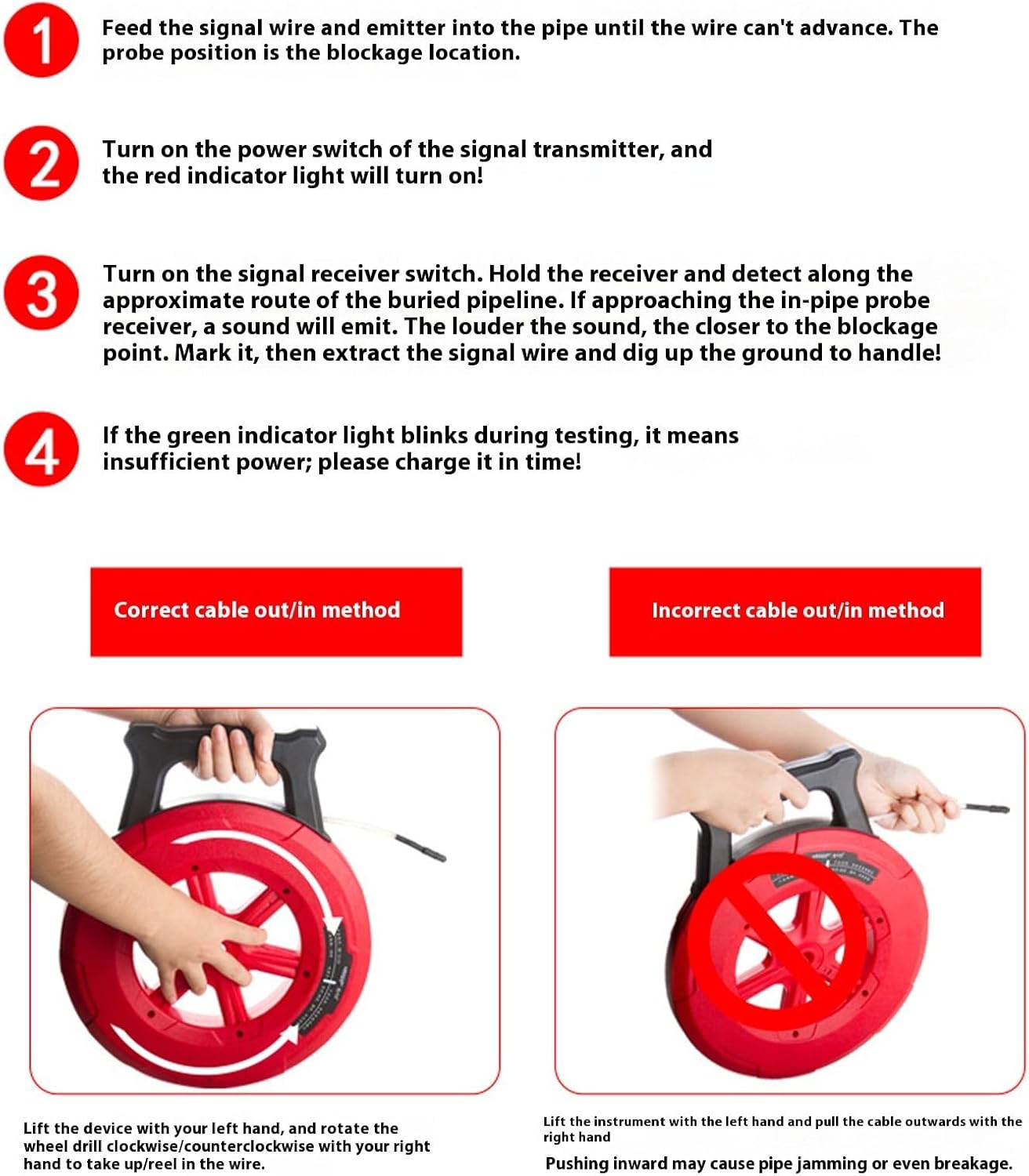 Professional PVC / Metal Pipe Detector 20 / 30 / 40m IP67 Clog Locator With Rechargeable 2600mAh Battery Features: Professional Pipe Blockage Detector with IP67 Probe Accurately locates hidden obstructions in metal pipes, PVC conduits, and water lines while maintaining durability in wet environments Features adjustable sensitivity control for precise blockage pinpointing, 20 / 30 / 40 meter detection ranges, and long working time from its 2600mAh rechargeable battery via USB C compatibility Ideal for plumbers, construction technicians, and enthusiasts requiring pipeline inspection during renovation projects or maintenance operations Perfect for detecting embedded pipes behind wall, troubleshooting drainage systems, and ensuring safe drilling in residential / commercial construction site Complete set includes probe accessories for multi surfaces detection, noise isolating headphones for clear signals alerts, and a portable storage bag for organized fieldwork Specifications: Component: ABS Frequency: 300Hz Working Temperature: 10-40℃ Pattern: 20m / 30m / 40m Package Includes: 1pc transmitter host ( including battery) 1pc receiver ( including battery) 1pc double-head charging cable 1pc headphones 8 sets of transmitter probe accessories 1pc glues 1pc Instructions for use Note: Please allow 1-2cm errors due to manual measurement Due to difference between different monitors, the picture may not reflect the item actual color