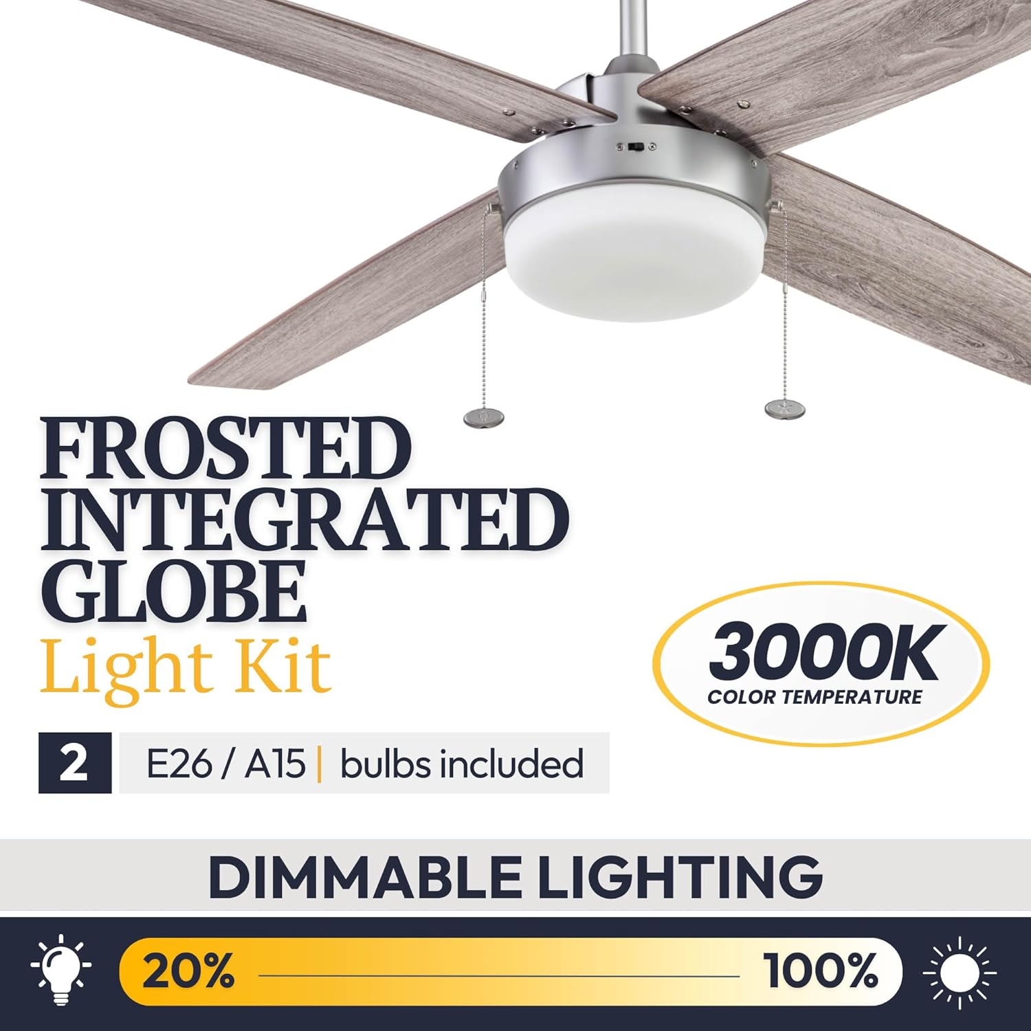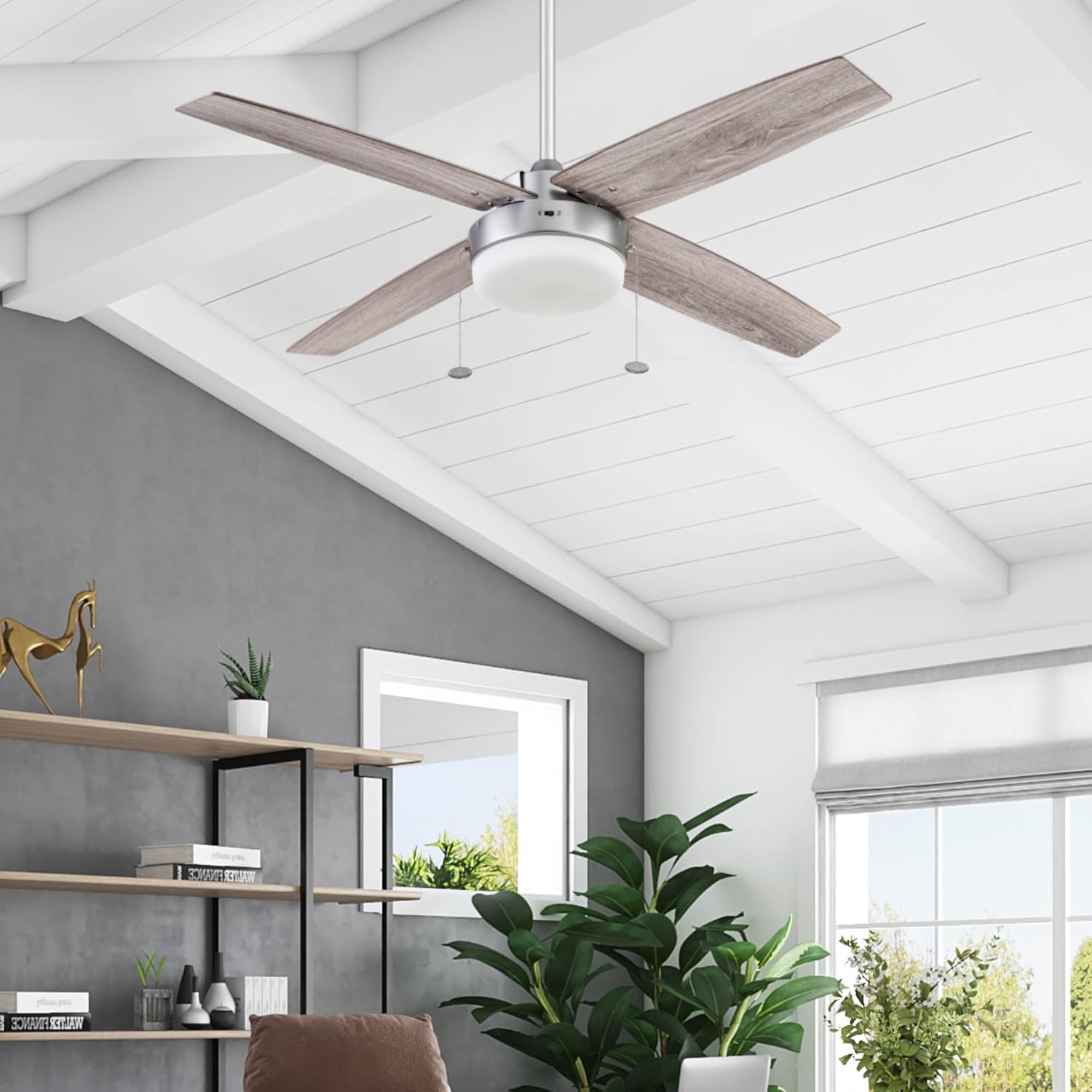 The Prominence Home Memphis indoor ceiling fan has a minimalistic charm and modern appeal certain to fit flawlessly in your contemporary spaces. This 52-inch ceiling fan is sculpted with rounded edges perfectly balanced by high contrasting blade angles. Its sleek cylindrical body houses a powerful, integrated dimmable LED light adding simplicity to style. This contemporary fan features a beautiful pewter finished body expertly designed with four clean-lined, reversible blades with a different finish on each side. One side comes in a beautiful gray oak finish that pairs well with coastal styles, while the other side showcases a dark fir finish which harmonizes well with modern farmhouse aesthetics - the choice is yours! the robust motor and design provide adjustable, reversible air movement that is ultra-efficient whether you want to cool down on those sweltering summer days or circulate warm air in the cold months of winter. To ensure your long-term satisfaction, this fan is backed by a limited lifetime warranty. The Prominence Home Atlas gives you all the quality functions you deserve while providing the impressive eye-catching style you crave.