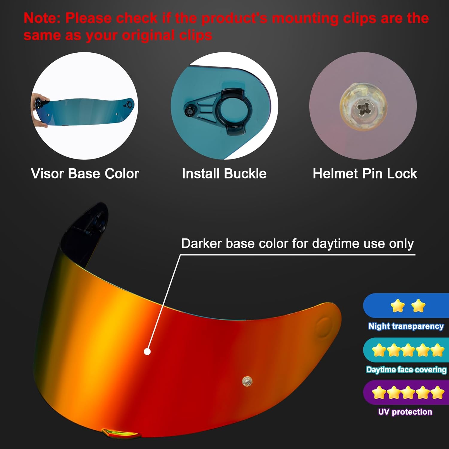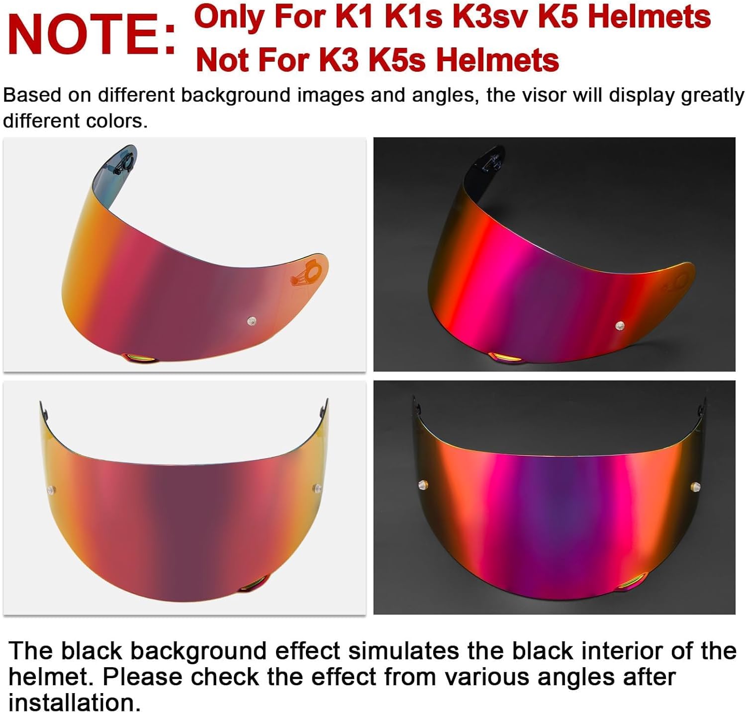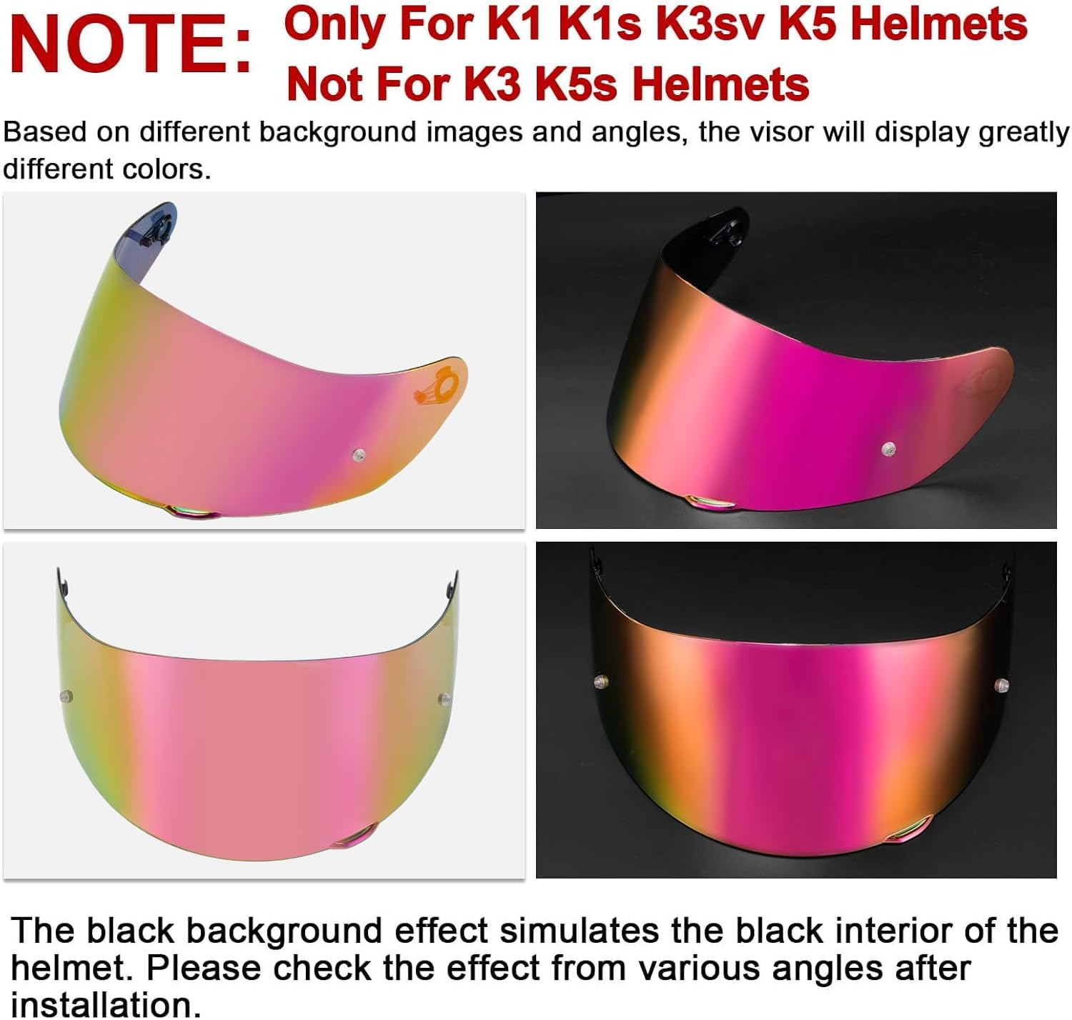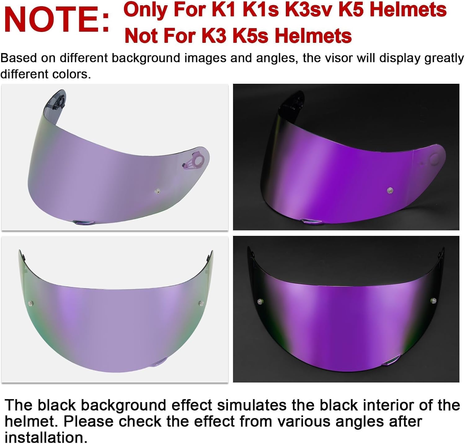 Fitment(Use day and night) Helmet visor Fits for k1 Helmet visor Fits for k1s Helmet visor Fits for k3sv Helmet visor Fits for K5 SpecificationsItem Type: k1 k1s k3sv K5 visor Functional Features: Sunshade during the day,UV ProtectionMaterial: PC Plastic Color: Various colors availablePackage: 1 X k1s visor NOTE1. Due to different angles, different light and other reasons, the helmet visor will have a greater impact on the color of the lens. Please be informed. 2.helmet shield are produced in batches. The background color of the helmet visor may be slightly different in different batches. The color adjustment is uncontrollable. The pictures are for reference only. Everything is subject to the actual object. For those who have extremely strict color difference requirements, please Buy with caution.