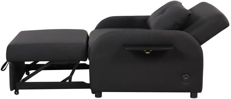 The sofa bed feature loose backrest cushions, side pockets on the armrests which are for magazines or remote control. The clean lines of the body of the sofa are carried through to the boxy, square track armrests which is emphasied by the flanged detailing running along the edges of the armrests, seat, back rest and the loose cushions .as a sofa bed, it is the solution to transform a space for unexpected overnight guests, or just a handy spot for a nap.The rather firm seat upholstery and the rather soft back cushion ensure comfortable sitting - and with just a flick of the wrist, the sofa is transformed into a fully-fledged bed.The table top is like a pair of small wings that can hold small handy items, such as a phone or a glass of water. Using every inch of space as wisely as possible. The charge can avoid the clutter of wires and make your room look more tidy.Upholstery Material LinenFrame Material:Iron+MDFSeat Construction:FoamLeg Material:PlasticSize: as shownSet Includes1*Sofa bed(no other presentation items included).Notice:1. Due to manual measurement, please allow 2-3% error, before you bid, please make sure you don't mind.2. The color may vary due to different displays, please refer to the actual product.
