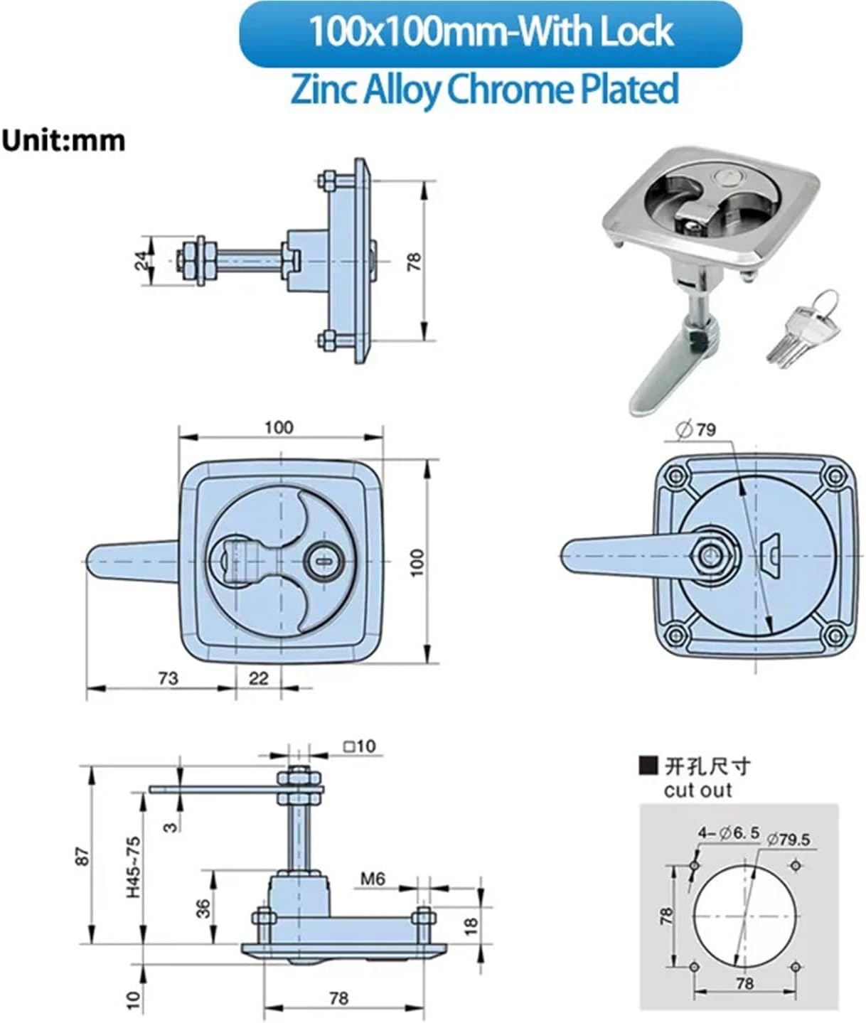 Gate Locks==========Keys Included : YesFit Door Thickness : >55mmApplication : EntranceSurface Finishing : Chrome PlatedMaterial : Zinc Alloy