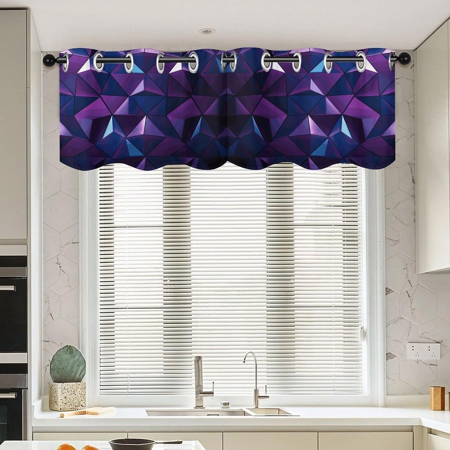 Perfect Pair Printed Curtain - Purple Geometric Light Filtering Modern Window Décor Elevate your windows with our beautifully designed two-piece Purple Geometric curtain set, combining a functional printed curtain with an elegant coordinating valance. Crafted for versatility, this Purple GeometricCurtain is the ideal solution for adding privacy, style, and controlled light to any room. Premium Fabric & Modern Design: Crafted from premium fabric, this Purple Geometric Curtain maintains a soft hand-feel and a graceful drape over time. The elegant print and smooth texture provide a sophisticated look that enhances your home's ambiance. Optimal Light Filtering & Protection: This Purple Geometric modern curtain effectively filters harsh sunlight, creating a softly illuminated and comfortable atmosphere. It helps protect your furniture and flooring from UV damage while providing a good level of privacy. The fabric is resilient and designed for easy care. Versatile Application: This Purple Geometric ready-to-hang Curtain is designed for broad compatibility. The curtain features standard 4.5cm grommets for smooth gliding on most curtain rods. With dimensions of 52" W x 18.1" H per panel, it's perfectly suited for various window styles. Ideal as a charming kitchen curtain or cafe curtain for bottom-up coverage, it also functions perfectly as a tier curtain. Whether you're looking for a stylish printed curtain for your living space, a functional light filtering curtain for a bedroom, or a complete look with a curtain valance, this Purple Geometric set delivers both style and purpose. Set Includes: Two printed curtain panels Bring a cohesive and stylish upgrade to your home with this Purple Geometric versatile curtain .