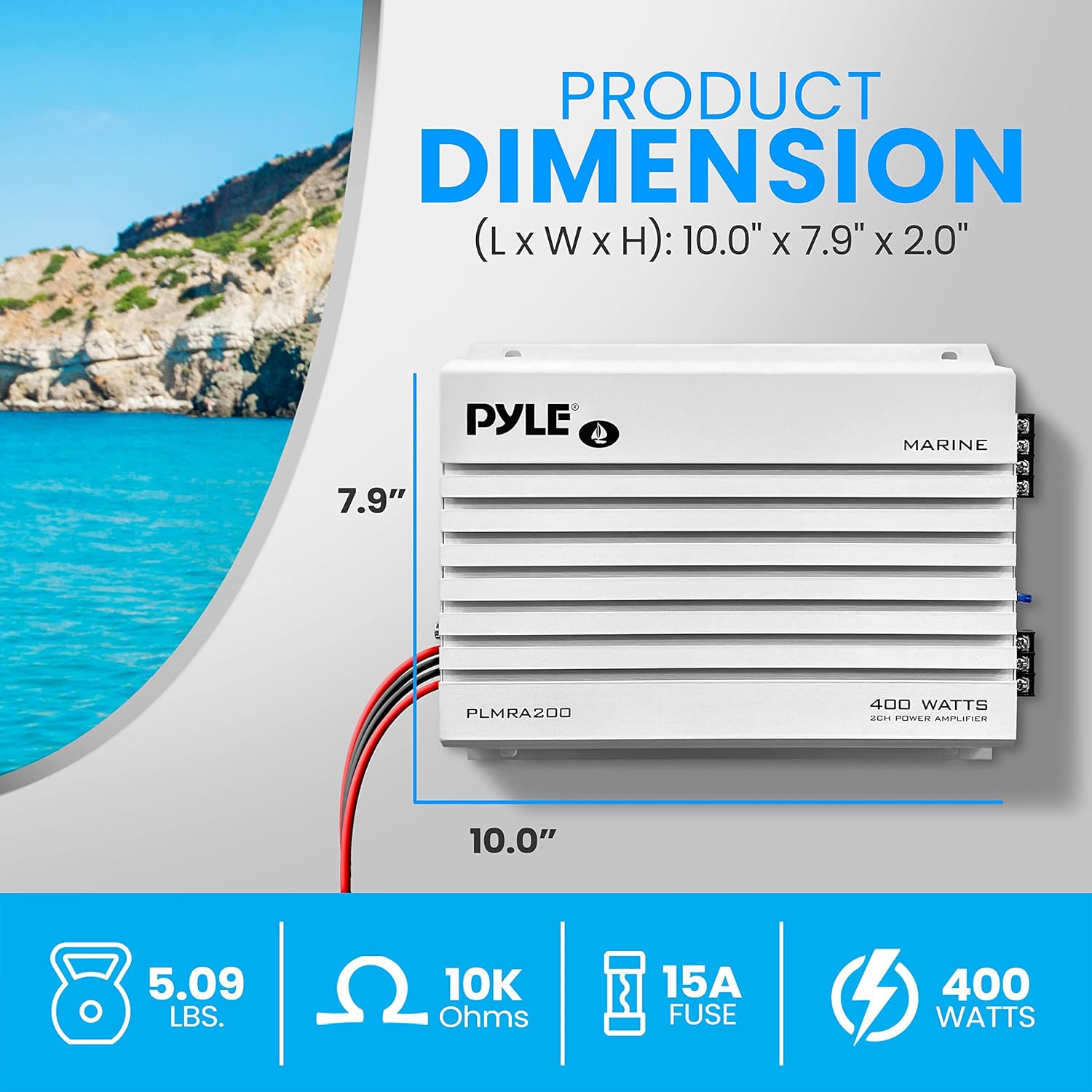 Pyle Hydra Marine Amplifier Upgraded Elite Series 400 Watt 2 Channel Bridgeable Audio Amplifier-Waterproof, Dual MOSFET Power Supply, GAIN Level Controls, RCA Stereo Input & LED Indicator (PLMRA200)This Pyle Hydra amp will power your speakers on the dock, in your boat, or by the pool – it’s completely waterproof. This marine amp is compatible with a variety of head units and sources. For protection, count on the heavy duty aluminum alloy heatsink to prevent overheating, as well as thermal, overload, and short circuit protection. Comes complete with mounting screws and hardware. Features: Bridgeable Audio Amplifier 2-Channel System Dual MOSFET Power Supply Marine Grade Construction Waterproof Marine Rating IP-01 Stereo / Bridge Mode Selection Switch Adjustable Input GAIN Level Control RCA (L/R) Input Connector Jacks High Level Speaker Input Connector Power & Protection LED Indicator Lights Gold-Plated Speaker Output Terminal Connectors Crossover Frequency Control Anti-Thump Delay Circuitry Built-in Thermal, Overload & Speaker Short Protection Heavy Duty Aluminum Alloy Heatsink Remote Turn ON/OFF Technical Specs: MAX Power: 400 Watt RMS Power: 200 Watt Amplifier Class: AB Fuse Type: 15A Crossover Frequency Adjustable: 40 - 450Hz Frequency Response: 10 - 30kHz +/-3dB Input Impedance: 10k Ohms Input Sensitivity: 250mV-1V Matching Speaker Impedance: 4-8 Ohms T.H.D.: <0.04% Power Supply: DC 12V Dimensions (L x W x H): 10.0'' x 7.9'' x 2.0'' Sold as: Unit Weight: 5.09 lbs.Pyle PLMRW8 8-Inch Outdoor Marine Audio Subwoofer - 400 Watt Single White Waterproof Bass Loud Speaker For Marine Stereo Sound System, Under Helm or Box Case Mount in Small Boat, Water VehiclePyle Model : PLMRW8 8'' Marine Subwoofer, 800 Watt Single 8" 400 Watt White 4 Ohm Marine Subwoofer 8'' High Quality Polypropylene Cone Water Resistant Construction Design 40 oz Magnet Structure 1.5'' High Temperature Voice Coil 400 Watts Peak Power Frequency Response: 35-3.5K Hz 4 Ohm Impedance Sensitivity: 91 dB Overall Diameter: 8.5'' Mounting Depth: 3.60'' This 400-watt Pyle Hydra subwoofer will blow you out of the water! It's constructed from water resistant plastic, supporting a 8' high quality polypropylene cone. The 40 oz. magnet structure and 1.5' high temperature voice coil boom with power and achieve a frequency response of 35 Hz to 3.5 kHz.