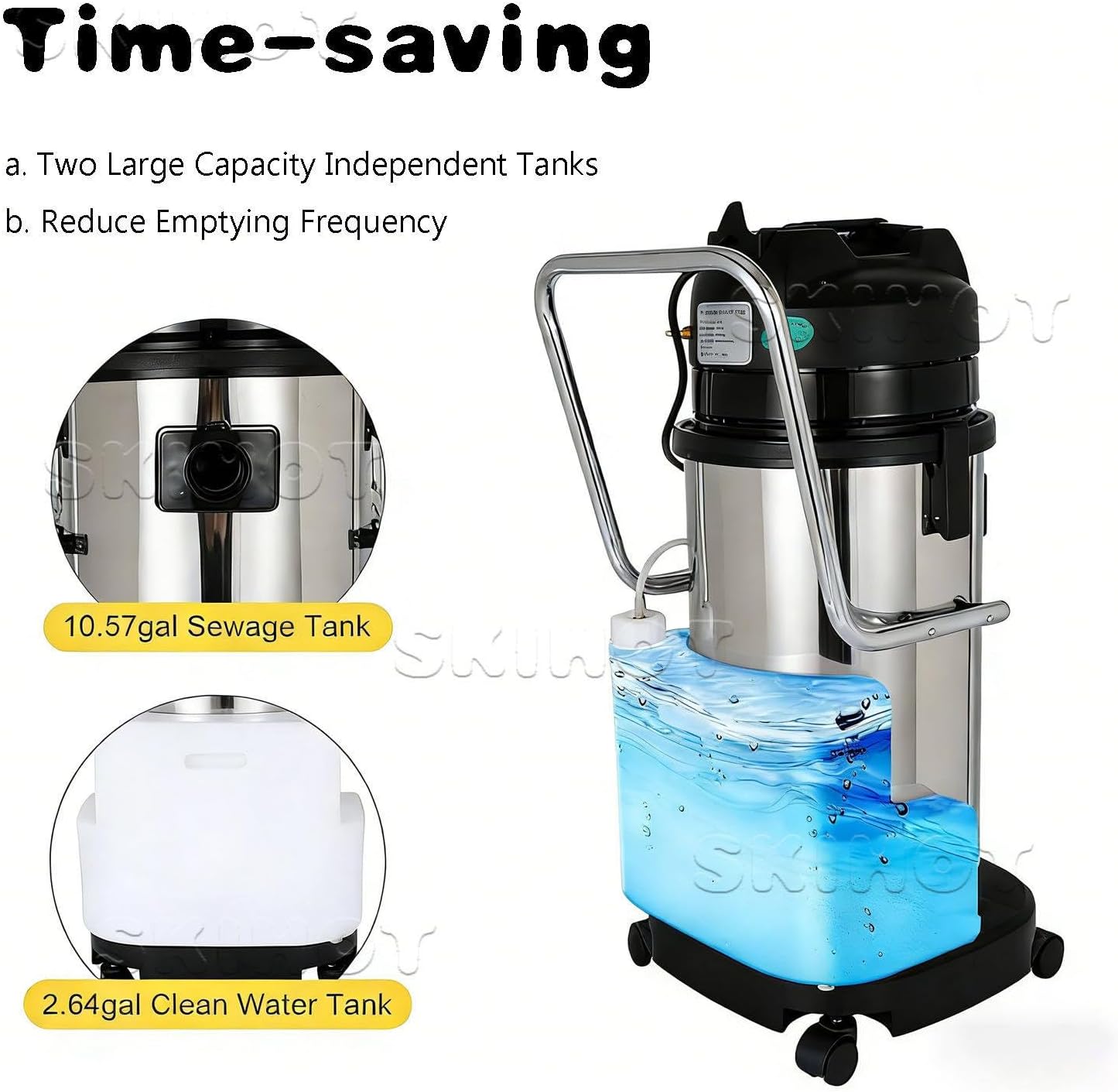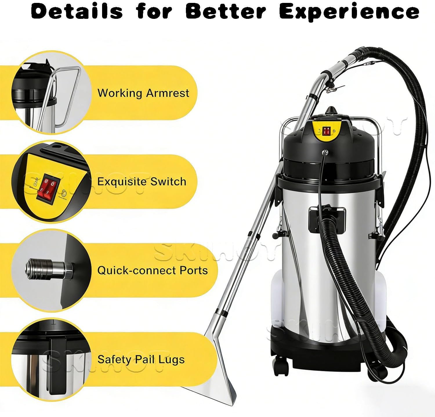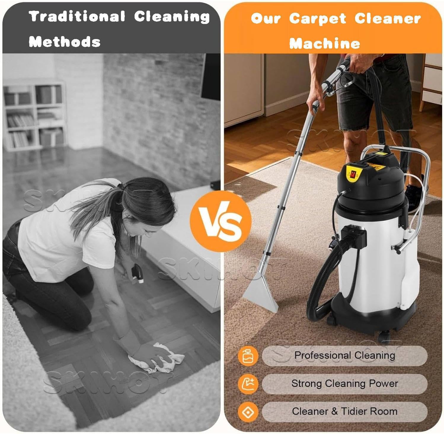 ✔✔✔ Commercial carpet cleaner, wet and dry vacuum cleaner. It can be used to clean carpets, sofas, curtains, and other fabrics, and features both vacuuming and water cleaning functions. Highly efficient cleaning, saving you time. A great helper for your home cleaning.▶ Product Name: Carpet ExtractorMain Unit Capacity: 20L/30L/40LClean Water Tank Capacity: 10LTotal Power: 1079WWater Pump Power: 34WVacuum Motor Power: 1000WHeight: 720mm/830mm/890mmDrum Diameter: 335mmCooling Method: Circulating Air CoolingAirflow: 53L/sSuction: 230mbarPower Cord Length: 7mAccessory Diameter: 40mmChassis Diameter: 125mmPressure: 87 psiNet Weight: 15.5kg / 15.8kg / 17.4kgGross Weight: 17.3kg / 17.6kg / 18.4kgAccessory Gross Weight: 5.2kgPackaging Dimensions: 455*410*755mm / 455*410*855mm 455*410*920mm▶Main Unit Capacity: 60LClean Water Tank Capacity: 20LTotal Power: 2079WWater Pump Power: 34WVacuum Motor Power: 2000WHeight: 940mmDrum Diameter: 440mmCooling Method: Circulating Air CoolingAirflow: 106L/sSuction Power: 250mbarPower Cord Length: 8mChassis Diameter: 125mmPressure: 87 psiNet Weight: 31.5 kgGross Weight: 35.8 kgPackaging Dimensions: 640*540*990mm▶Packaging List:1*Commercial Carpet Cleaner1*Wet Suction Head1*Vacuum Suction Head1*Long Flat Suction Head1*Round Brush1*Small Nozzle1*Large Nozzle2*Hose2*Steel Pipe1*English Instruction Manual