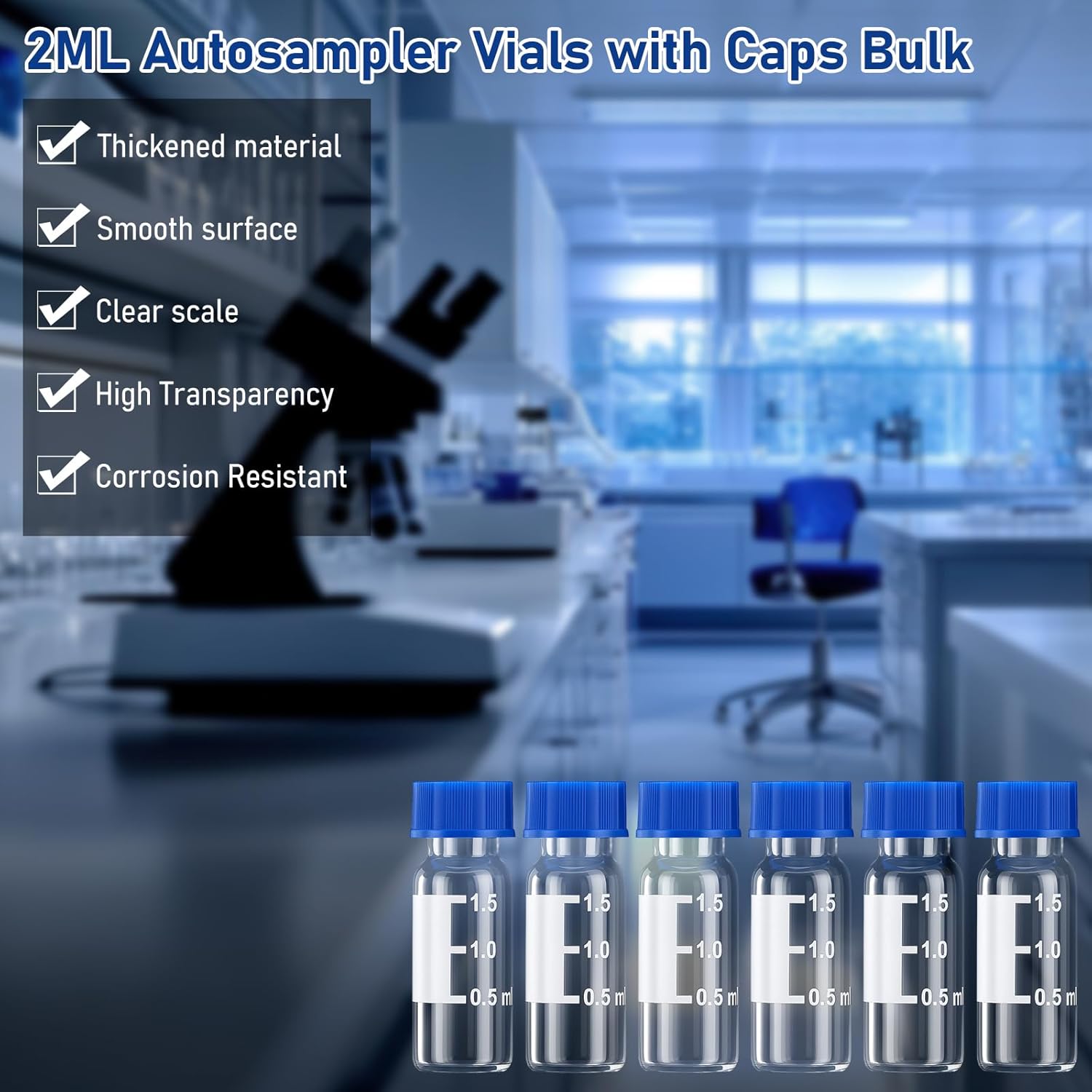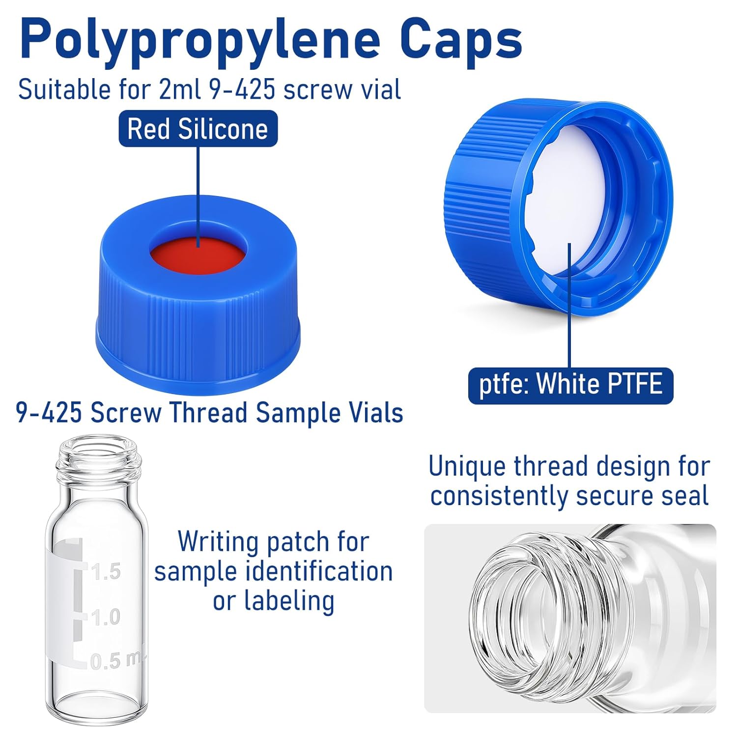 Features: Precision design: The autosampler vials are produced with attention to dimensional consistency (12mm diameter x 32mm height) with a 9-425 threaded opening. It seeks to reduce irregularities that could potentially affect automated instrument handling Convenience: Each autosampler vial comes pre - assembled with its closure, prepared for immediate application in laboratory applications. Saves time otherwise spent assembling vials and caps, improves experimental operation efficiency. Specifications: Material: borosilicate glass (vial), abs plastic (cap), PTFE/silicone (septum) Color: clear and blue Size: approximately 12mm (diameter) x 32mm (height). Capacity 2ml Package includes: 1000 X 2ml glass vials 1000 x Screw caps Notes: Manual measurement, please allow slight errors on size. The color may exist a slight difference due to different screen displays.