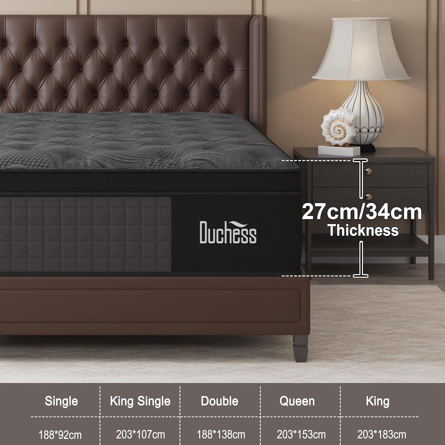 1. Features and Advantages The Duchess mattress offers unparalleled comfort and support, aiming to provide a comfortable, supportive, and convenient sleeping experience. The embedded individually wrapped spring isolation technology reduces disturbances, edge reinforcement provides better support and prevents roll-off. Made with CertiPUR US & OEKO certified foam ensuring safety, and OEKO-TEX Standard 100 certified, passing the test for harmful substance content, low allergenic materials, and 99% dust mite resistant. Suitable for all body types and four sleeping positions, comfortable support for joints and muscles, helping the body have a better sensation. 2. High-Quality Materials Top filling features 480g organic cotton knit fabric from Turkey, organic cotton is softer, shinier, more porous, and has better moisture absorption. Comfort layer consists of 100% comfortable luxurious latex and memory foam. Support layer contains 30D high-density HD foam, CertiPUR-US certified, 99% insect and mite resistant, sweat-absorbent, and breathable. 3. Enhanced Structural Design The mattress has medium firmness, 7-pocketed encased springs, and edge reinforcement to provide sturdy support, preventing sagging and rolling. Triple-tempered alloy springs have better elasticity, are rust-resistant, and highly durable. Elevate your sleep with the Duchess mattress, designed for unparalleled comfort, support, and convenience.