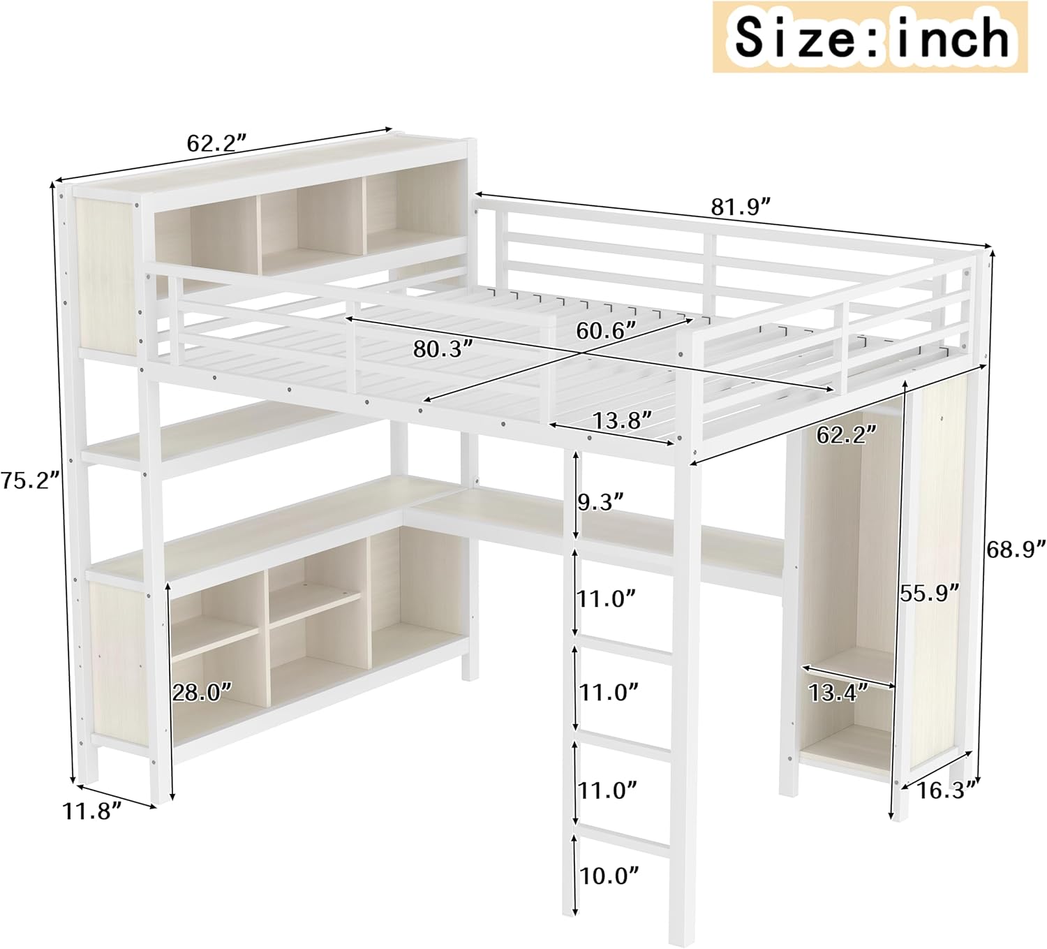 Maximize your space in style with this queen loft bed—the perfect solution for growing teens, college students, or adults who crave efficiency without sacrificing comfort. Crafted from heavy-duty steel, this metal loft bed ensures long-lasting durability and supports up to 350 lbs.Featuring a spacious L-shaped desk under the loft bed queen size frame, this setup creates a dedicated area for studying, working, or creative hobbies. The built-in wardrobe with a hanging rod and the side shelves provide ample storage, keeping your room neat and organized.Whether you're living in a dorm, apartment, or a small bedroom, this loft bed with desk and storage transforms limited square footage into a multifunctional oasis. Designed with full-length guardrails and sturdy ladders for safety and easy access, this queen loft bed with wardrobe blends functionality, security, and sleek modern design.Upgrade your room with this all-in-one queen size loft bed that combines comfort, workspace, and storage—all in one smart footprint.Product Type: Metal Loft BedColor: White Wood-grainMaterial: Metal+MDFSize: QueenOverall Product Weight: 225.53 LBSNumber of Package: 3Weight Capacity: 350LBSRecommend Bed Mattress Thickness: 6''