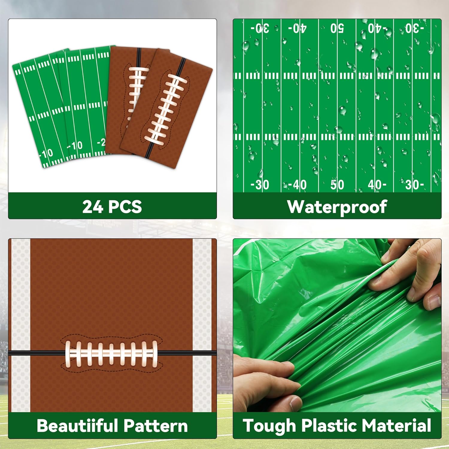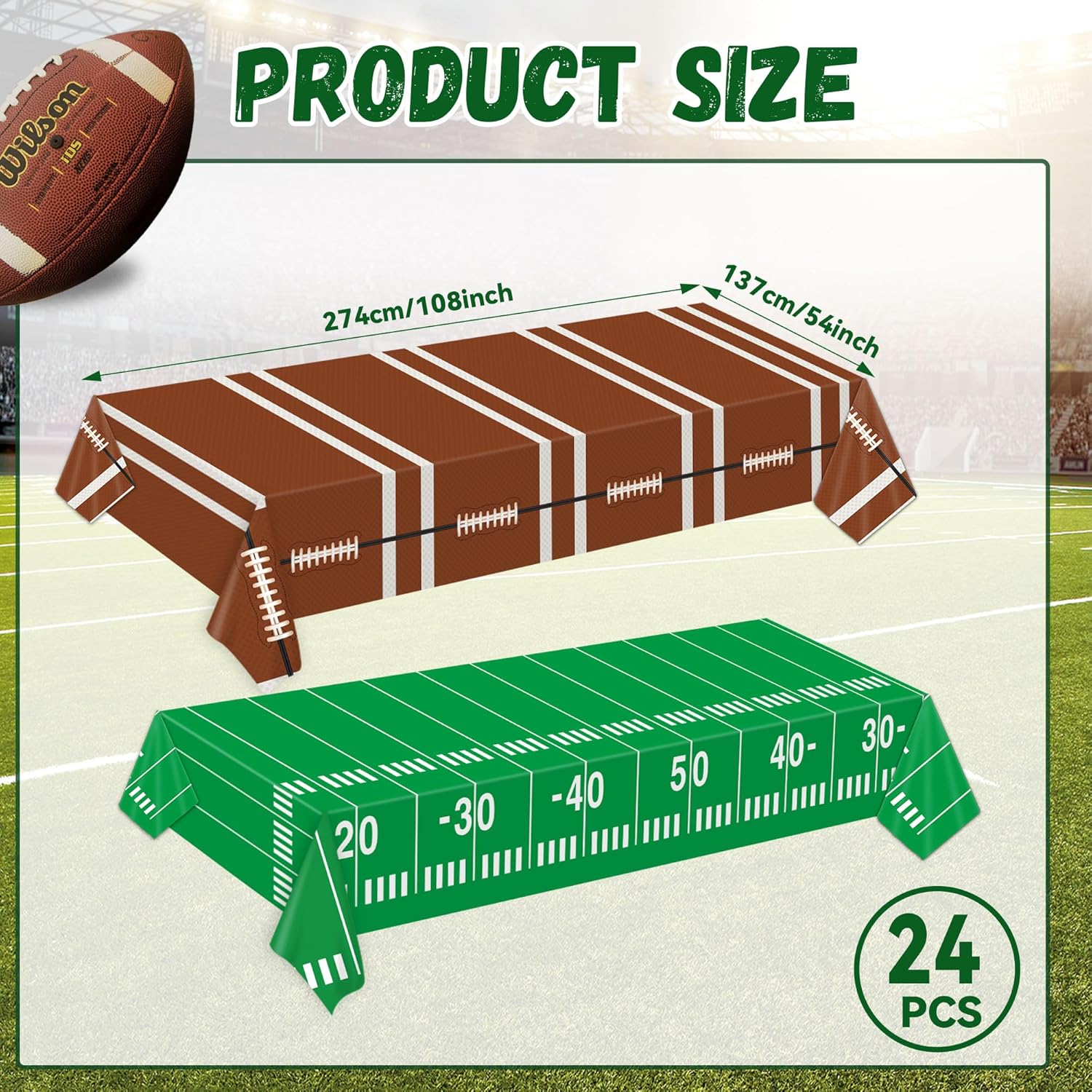 Qyeahkj 24pcs Football Party Tablecloth Disposable Plastic Sports Theme Table Cloths Football Birthday Party Table Covers Supplies for Game Day Tailgate Baby Shower Children's Day Father's Day Party This disposable plastic football party tablecloths with three colors,green,brown,and white, can be applied to a variety of scenes, such as dinner boy`s birthday football game baby shower Children's Day Father's Day wedding party, can meet the requirements of different parties and festivals, to create a colorful scene. Specifications: Material: Plastic Size: 274cm x 137cm / 108" x 54" Color: Green, brown, white Package Includes: 12 x green football field design party tablecloths 12 x brown football design party tablecloths