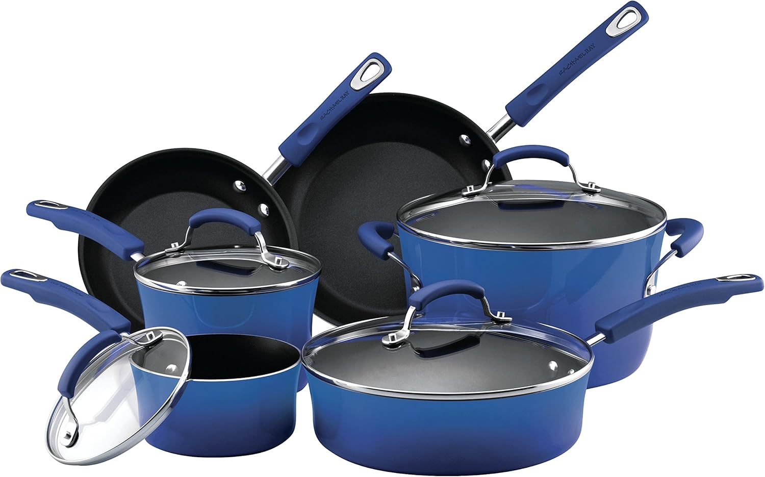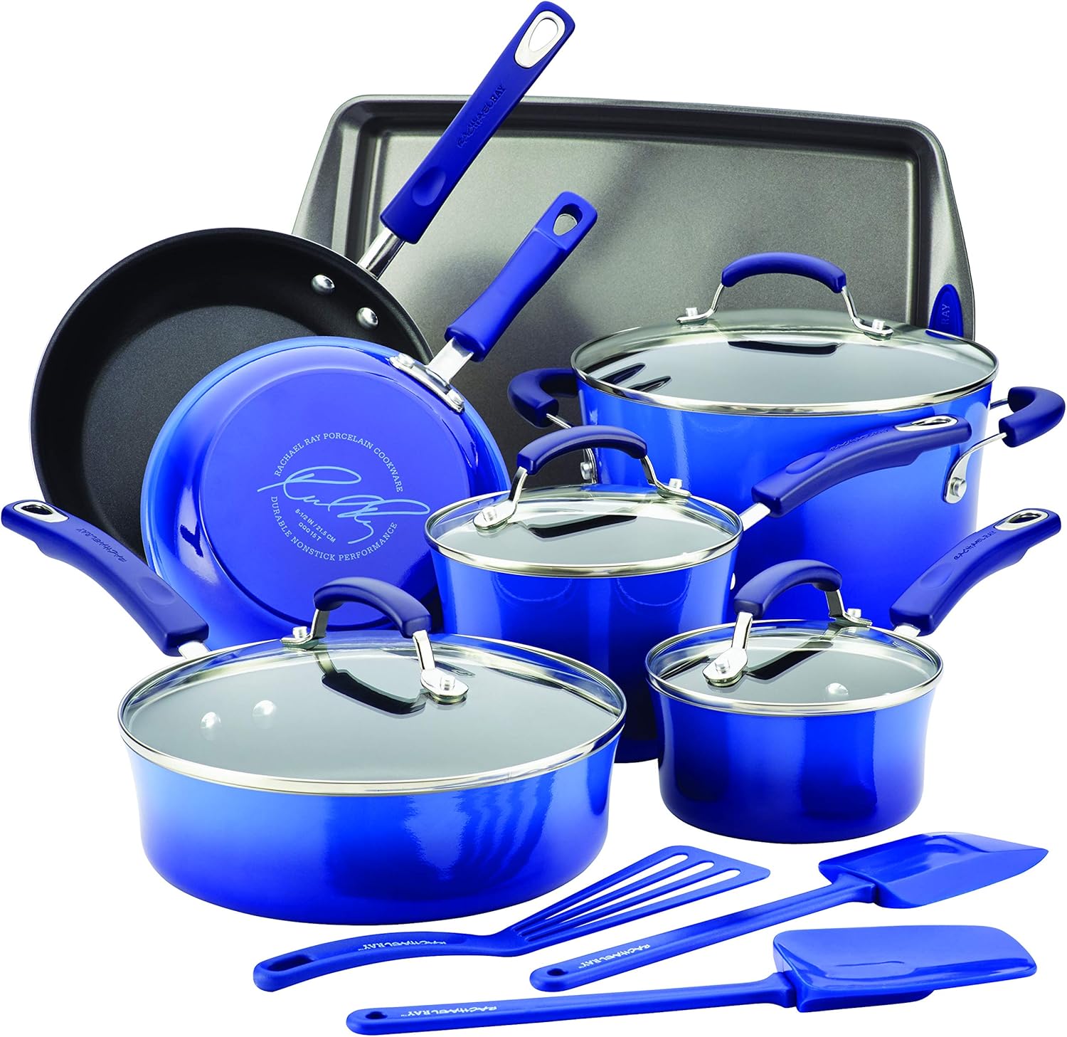 This beautiful and functional Rachael Ray Classic Brights Porcelain Nonstick 14-Piece Cookware Set has all the key shapes and sizes of pots and pans and is paired with a trio of must-have tools and a handy baking sheet. This stylish cookware with a two-tone gradient exterior adds a splash of modern color to your cooktop, while helping create delicious meals for the whole family. The nonstick interiors provide impeccable food release for easy cleanup. The rubberized dual-riveted handles offer strength and a comfortable grasp while cooking, and are oven safe to 350°F. The set even comes with must-have accessories that are dishwasher safe. The Oven Lovin’ crispy baking sheet is nonstick and oven safe to 450°F. Turn, flip and scoop with a spatula, a spoonula and a medium turner. These three handy tools are heat safe to 500°F. Equip your kitchen with the beautiful and functional Rachael Ray Classic Brights Porcelain Nonstick 14-Piece Cookware Set for all the key shapes and sizes of pots and pans and is paired with a trio of must-have tools and a handy baking sheet.