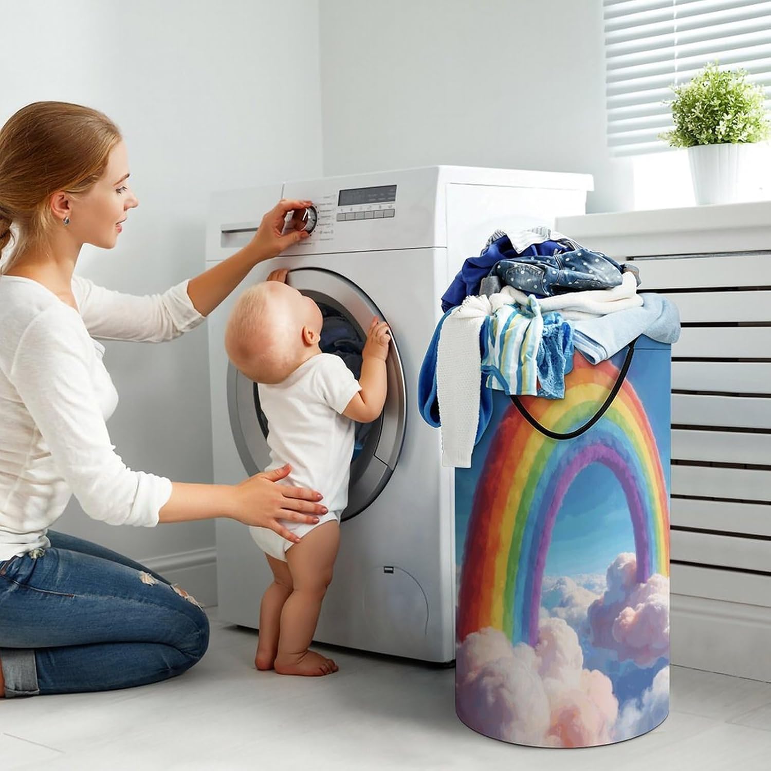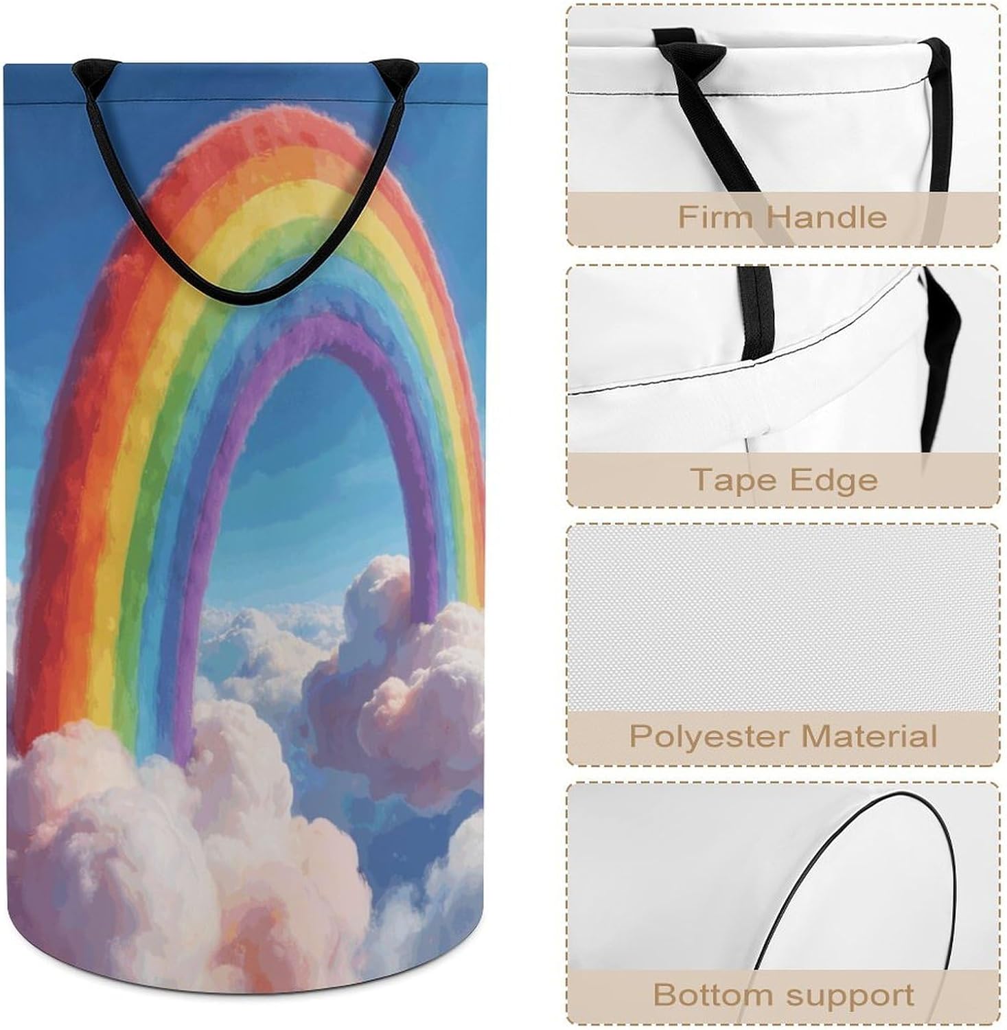 The pattern of the Rainbow hamper is printed with exquisite patterns, which makes the product more attractive.Chic design allows it to be used in the living room to hold throw blanket, pillows, and reading materials, as well as in the bathroom for towels, or as a laundry hamper.The laundry hamper adopted collapsible design, equipped with handles. It is lightweight and portable for using, storing, and moving conveniently.Rainbow Clothes hamper is suitable to store dirty clothes washing, place in the room to store toys, and other household goods, keep the house clean and tidy. Perfect laundry hamper for home, office, closet organizer, bedroom, bathroom, college dorm, etc.Gets out of your way when you need it to. This storage basket or laundry hamper is a good gift, which not only meets everyday storage needs but also carries deep care and love, a perfect way to turn thoughtfulness into warmth.