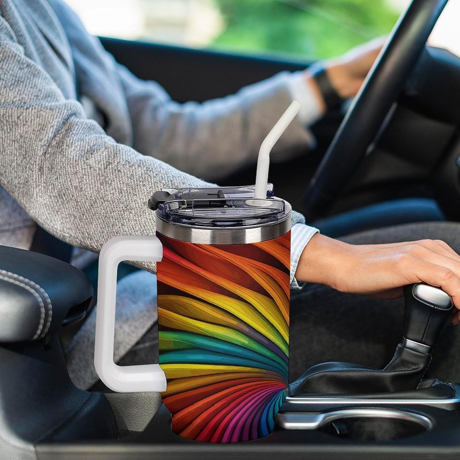 The simple tumbler is double walled and vacuum insulated to keep your drink hot or cold for hours.The cup is outfitted with an ergonomic handle, that is aesthetically designed for comfort. It comes with a straw lid and a straw so you can enjoy your favorite beverage on the go.The bottom of the cup is conveniently sized to fit car cup holders for easy portability. Fill your insulated tumbler with coffee, sweet tea, ice water, milkshakes, juice, cocktail, lemonade and more!If you are looking for the perfect birthday or holiday gift, don't miss this one. It can be a surprise gift for women, friends, family, couples.If you have any questions during your purchase or gifting process, please reach out to us—we're happy to help!