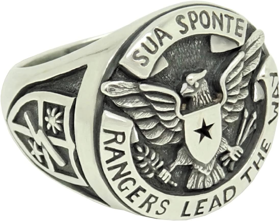 “SUA SPONTE” RANGERS STERLING SILVER 925 MEN’S RING. Rare piece, top quality, best craftsmanship, handmade. Intricately detailed lines. Excellent new condition stamped 925. Weight around 18-21 grams. The 75th Ranger Regiment, also known as Army Rangers is the U.S. Army’s premier light infantry unit and special operations force within the United States Army Special Op-erations Command. The regiment is composed of a regimental headquarters company, a military intelligence battalion, a spe-cial troop’s battalion, and three Ranger battalions. Both symbols on the ring are very emblematic for the 75th Rangers Regiment. The sign on top “SUA SPONTE” is their motto which means “Of their own accord” The phrase recognizes the fact that a ranger volunteers three times; for the Army, for Airborne School, and for the Ranger Regiment.