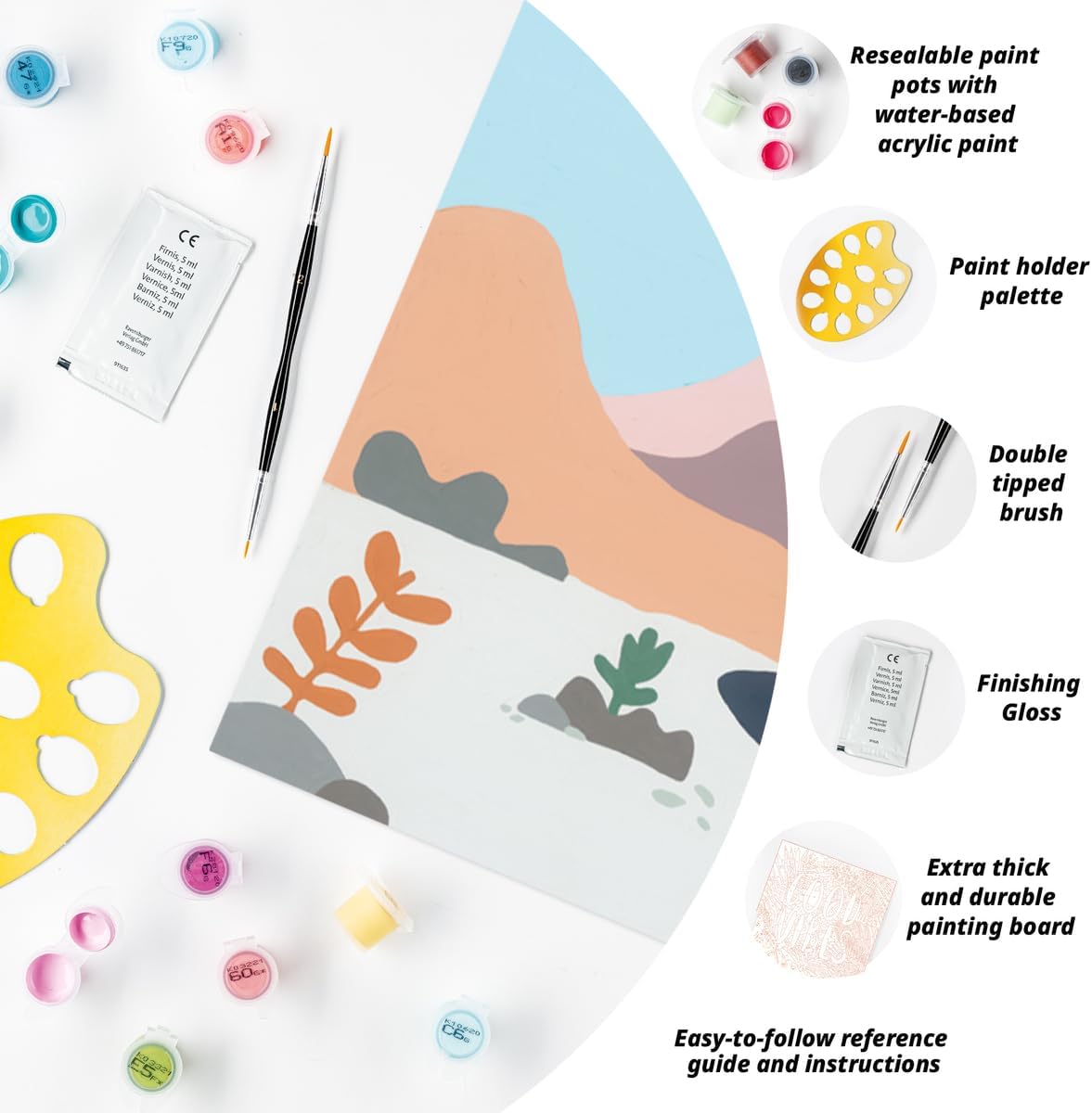 | Included Components | 1 cardboard canvas, 1 painting reference guide,, 1 packet of finishing gloss, 1 double-tipped brush,, 1 set of simple instructions, and 1 picture hanger., 2 paint holder palettes,, Water-based acrylic paints in resealable pots, |