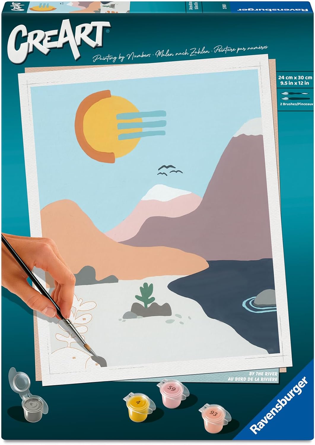 Soothe your mind, body, and soul with a creative break as you relax “By the River” with our CreArt Painting by Numbers set!Enjoy some mindful moments sitting “By the River” with this CreArt paint-by-number kit! Rest your mind and go to your peaceful place with no screens and no demands as you fill in each clearly numbered section, bit by bit. High-quality, odorless acrylic paints ensure excellent results. When finished, hang it as a gentle reminder to take time for some well-deserved self-care! De-stress and find success as you discover the joy of art in your heart today!Enjoy the relaxing and rewarding experience of creating art without the pressure of facing a blank canvas! The prepared patterns in this Painting by Numbers set lets you create a personal masterpiece you’ll be proud to display. A meditative activity, painting can help relieve the stress of the day while providing a satisfying sense of accomplishment!With the same dependable quality you’ve come to know in our puzzles and games, this premium paint-by-number kit comes with everything you need: a durable, smooth white painting board with clearly numbered sections; 18 easy-open/close water-based, odorless acrylic paints in matching numbered pots; finishing gloss; 2 wood-handle paintbrushes with fine points (#1, #2) for precise details; artist pallet to keep paint pots steady; picture hanger and easy-to-follow guide sheet. Frame not included.