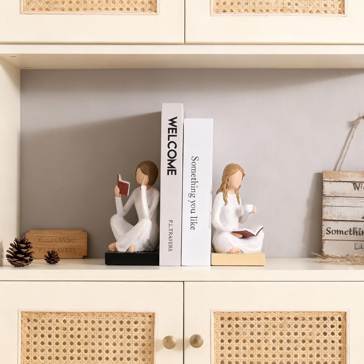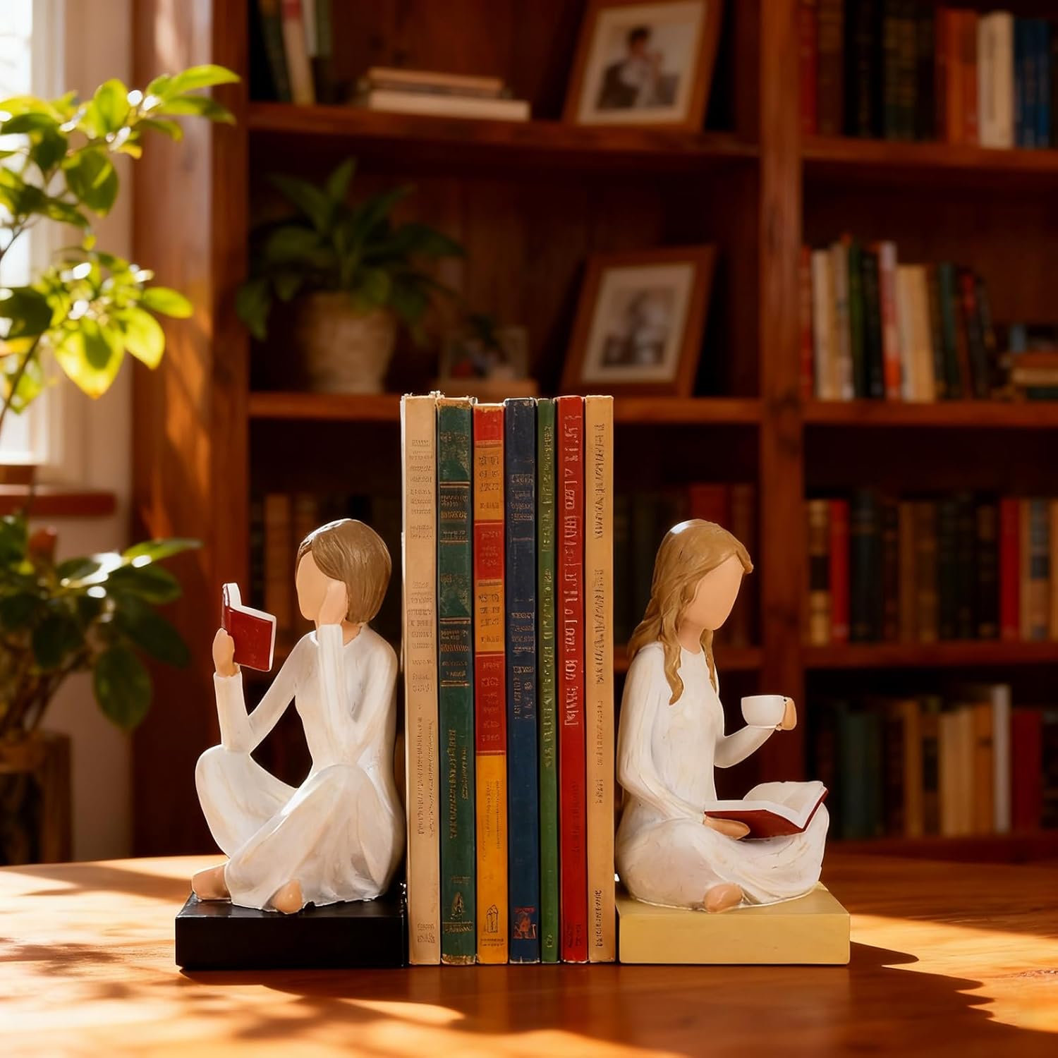 Bring a sense of calm and quiet beauty to your bookshelf with this reading girl bookends set, designed to reflect the simple joy of slowing down with a good book. The seated reading figure captures a peaceful everyday moment—focused, relaxed, and unhurried—making it a natural fit for book lovers who appreciate thoughtful details in their living space. Made from resin with a balanced, solid feel, each bookend weighs approximately 500 g (1.1 lb) and is designed to help keep books neatly arranged without drawing attention away from the overall shelf styling. The smooth, neutral finish and soft sculpted lines allow the pieces to blend effortlessly with modern, minimalist, or cozy home interiors. These bookends work beautifully in a variety of settings, from home libraries and reading nooks to office bookshelves and study desks. Whether placed together to frame a favorite collection or used separately on different shelves, they add warmth and visual interest while maintaining a clean, uncluttered look. Beyond everyday use, this set also makes a meaningful gift for readers and book lovers. Its quiet design language and timeless aesthetic make it suitable for birthdays, housewarmings, graduations, or any occasion where a thoughtful, lasting gift is appreciated. Rather than feeling trendy or seasonal, the design is intended to remain relevant and display-worthy year after year. More than simple shelf accessories, these reading girl bookends help create an atmosphere—one that celebrates books, quiet moments, and the beauty of everyday rituals. They are a subtle way to personalize your space, bringing harmony and intention to the place where your favorite stories live.