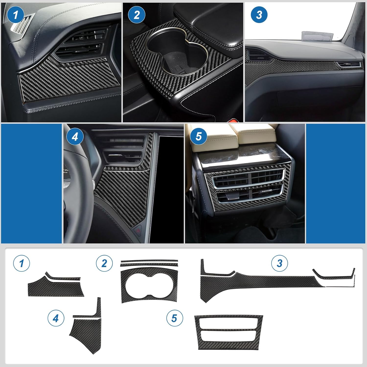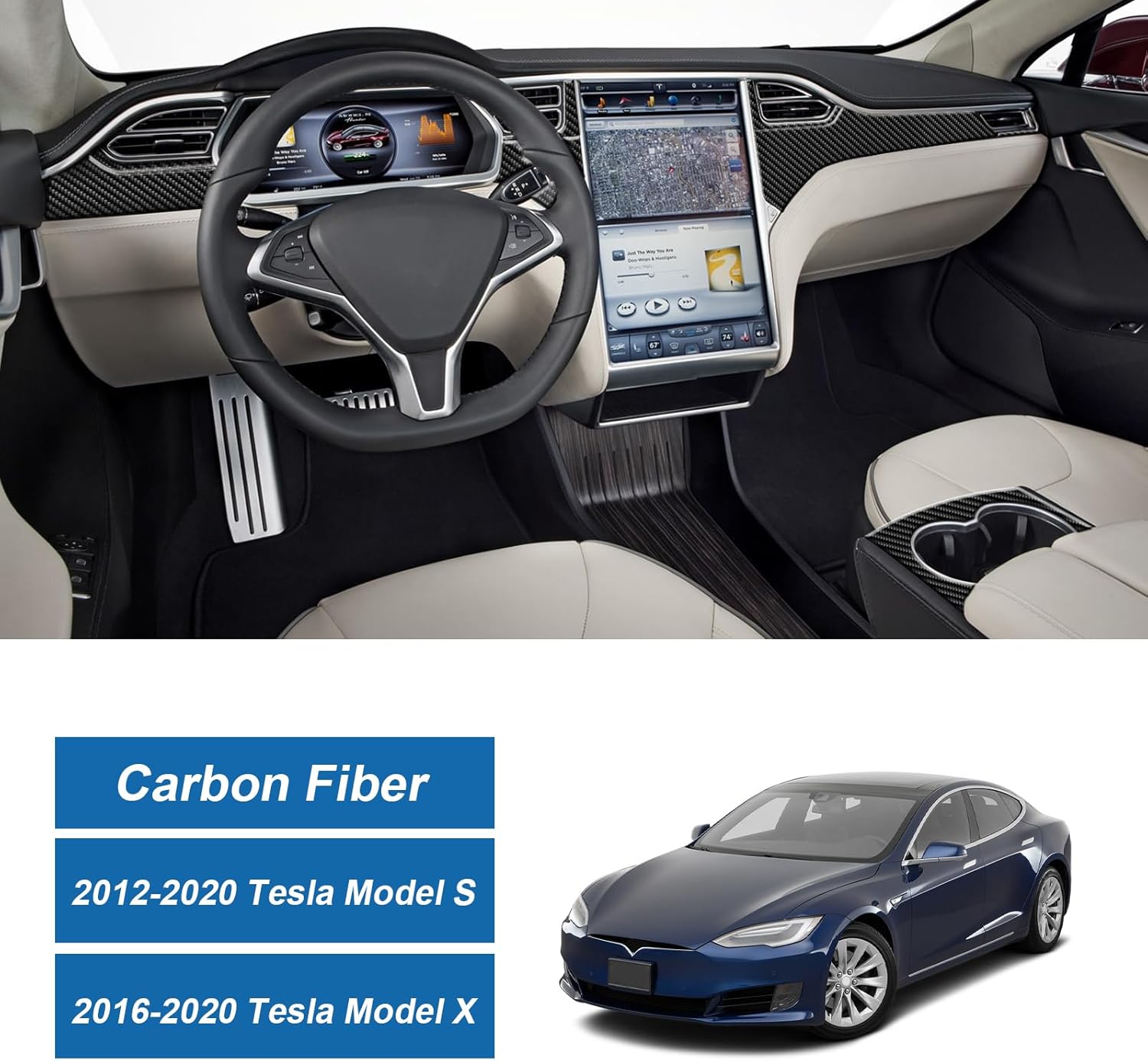 Fancemot Real Carbon Fiber Interior Trim Kit Compatible with 2012–2020 Tesla Model S & 2016–2020 Model X – Dashboard Panel Trim, Cup Holder Trim, AC Air Vent Trim, Interior Decor Sticker Accessories