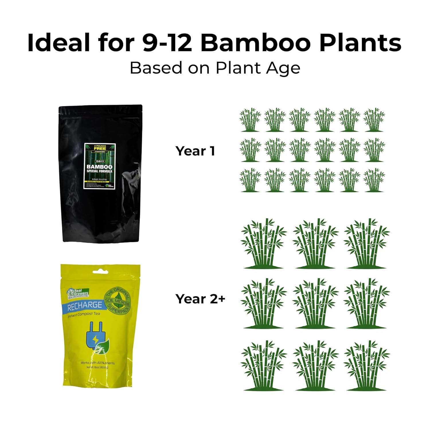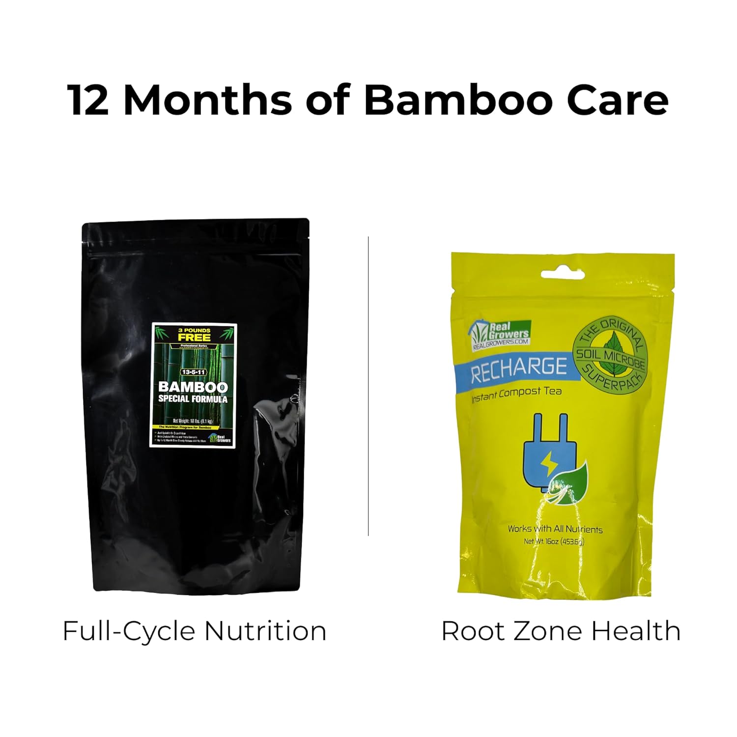 This bundle pairs 18lb of Bamboo Special 12-month fertilizer with 16oz of Recharge root support to provide long-lasting care for established bamboo hedges and landscape plantings. The programmed release fertilizer delivers up to one year of feeding with a single application, while Recharge supports strong root zones and balanced soil conditions. Ideal for larger privacy screens and multi-clump bamboo plantings. Not intended for lucky bamboo or indoor water-grown bamboo.