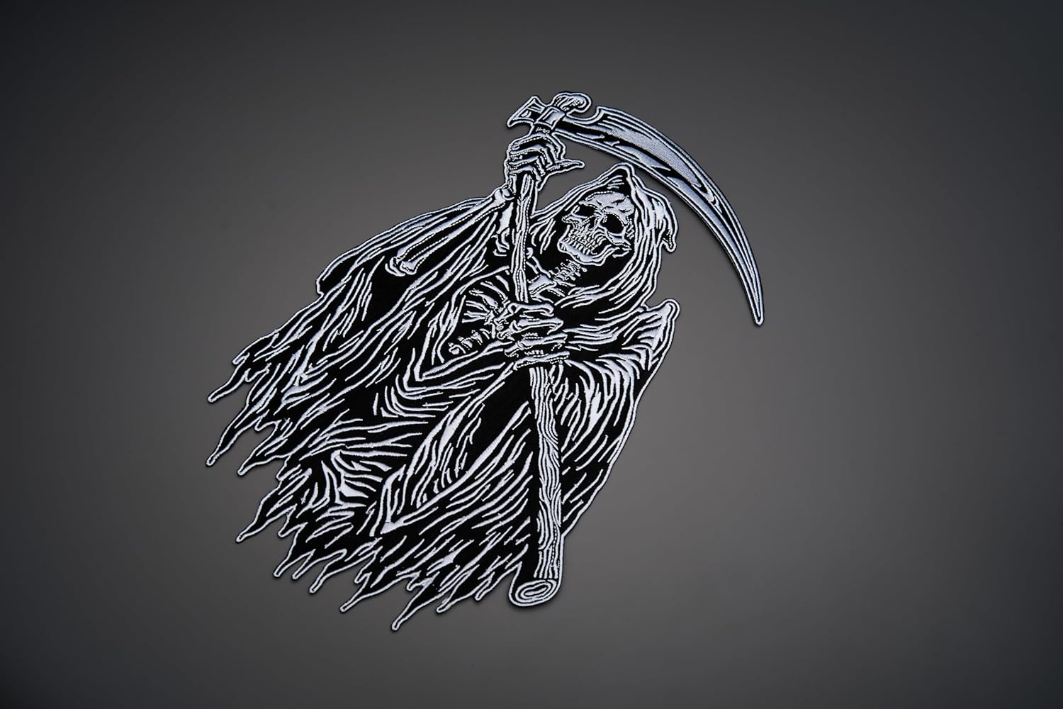 REAPER Large Back Embroidered Patch For Vest.Height: 11.80 inWidth: 7.60 inAll of our patches are iron-on.All our prices are degressive, just contact us for more information.How to apply an iron-on patch : Heat up your iron. You want your iron to be on its highest heat setting in order for the patch to properly adhere to the clothing.Plan your designPlace a thin cloth over the front of the patch.Iron on patch.Flip and repeat steps 3 and 4 on backside.Let it cool, and you're done!