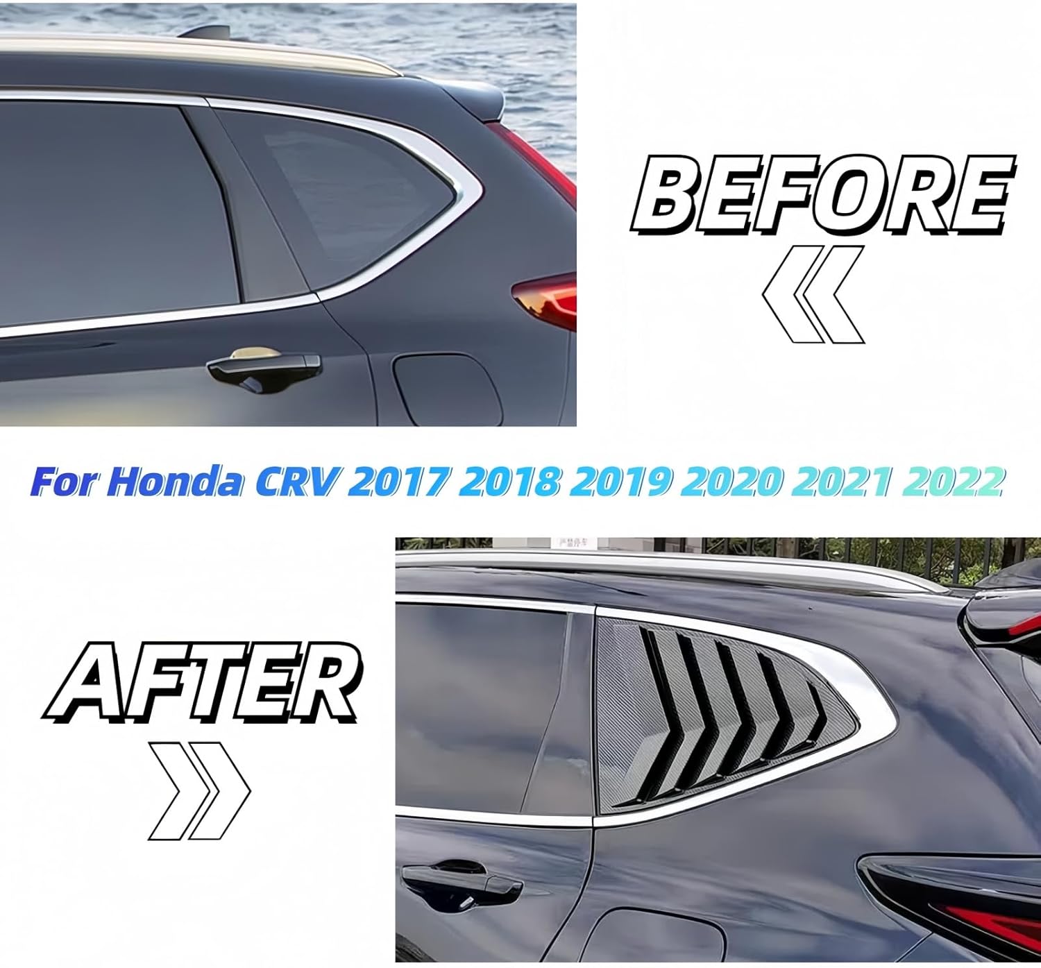 *FITS ALL MODELS BELOW Fit For For Honda CRV CR-V 2017-2022 *Package Includes: 1 Pair of Side Rear Window Louver *Features: 100% Brand New, OEM Fitment and Quality at Decent Price!Made of Durable & Light-Weight ABS Plastic MaterialBring a More aggressive Front End to Your Car ImmediatelyProtect Bumper From Scratching & Improve Sporty Appearance All at Once*Installing Template is NOT Included, Professional Installation Is Highly Recommended*