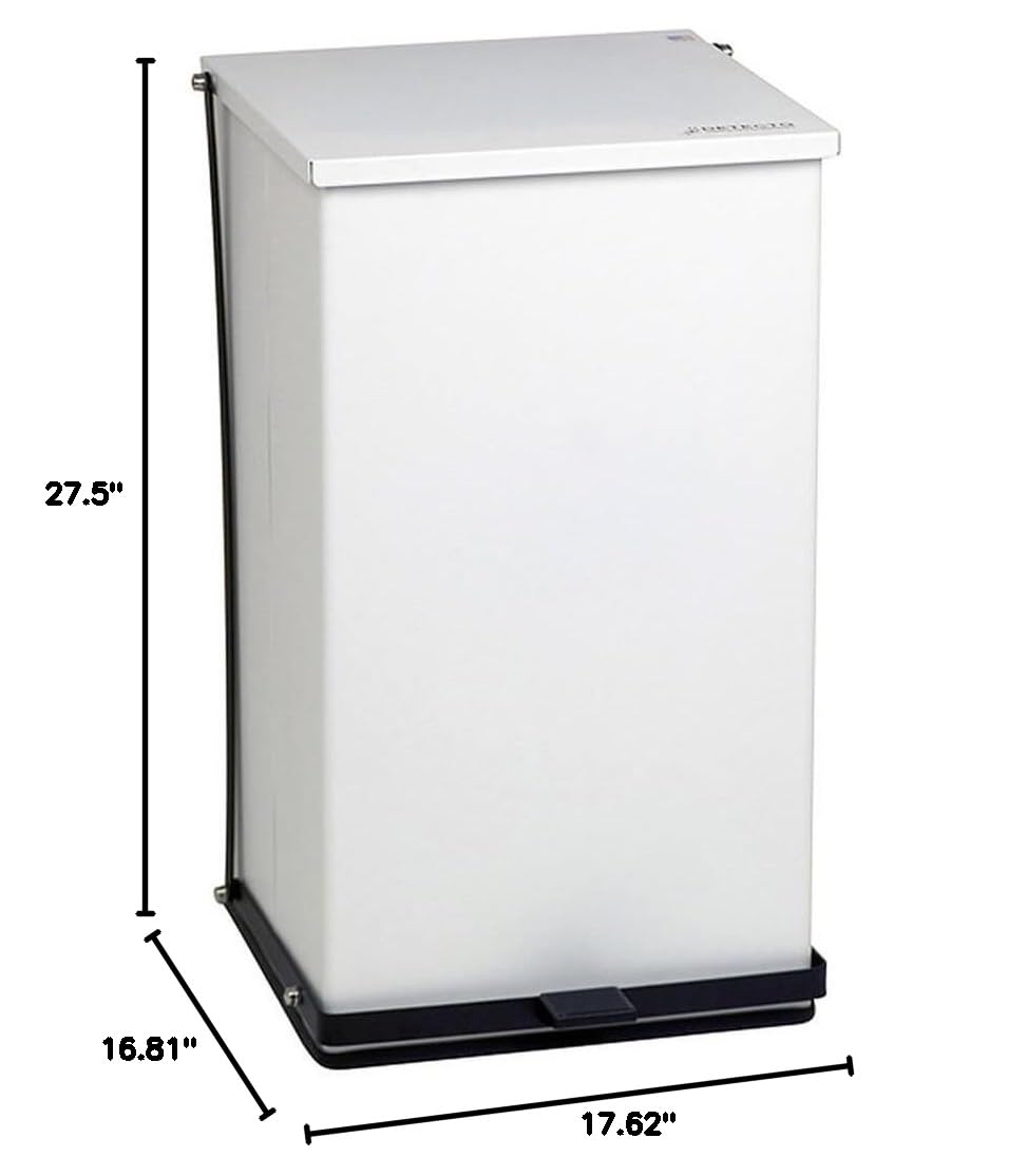 P-100 Capacity: 100 Quart (25 Gallon) Features: -Waste receptacle. -Economic, white epoxy is easily cleaned. -Flame retardant. -Self closing lid for sanitation. -Full width hinges. -Heavy duty foot pedal and linkage. Product Type: -Accessories. Country of Manufacture: -United States. Dimensions: Capacity 48 Quart (12 Gallon) - Overall Height - Top to Bottom: -23.5". Capacity 48 Quart (12 Gallon) - Overall Width - Side to Side: -13.19". Capacity 48 Quart (12 Gallon) - Overall Depth - Front to Back: -14". Capacity 32 Quart (8 Gallon) - Overall Height - Top to Bottom: -21". Capacity 32 Quart (8 Gallon) - Overall Width - Side to Side: -11.33". Capacity 32 Quart (8 Gallon) - Overall Depth - Front to Back: -12.63". Capacity 24 Quart (6 Gallon) - Overall Height - Top to Bottom: -16". Capacity 24 Quart (6 Gallon) - Overall Width - Side to Side: -11.33". Capacity 24 Quart (6 Gallon) - Overall Depth - Front to Back: -12.63". Capacity 100 Quart (25 Gallon) - Overall Height - Top to Bottom: -27.5". Capacity 100 Quart (25 Gallon) - Overall Width - Side to Side: -16.75". Capacity 100 Quart (25 Gallon) - Overall Depth - Front to Back: -17.75".
