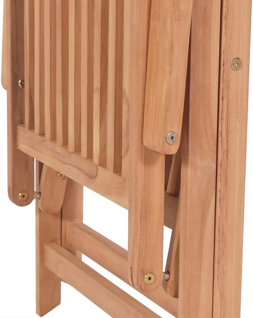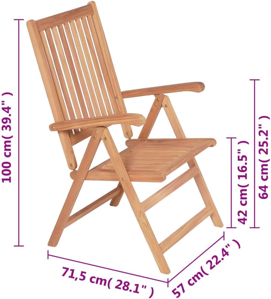 This stylish teak patio chair set will make a addition to your garden or patio. It is ideal for chatting with family and friends or just enjoying the weather.The folding and reclining wooden chair has a classic design. Constructed from extremely durable teak hard wood, this piece of teak furniture has been seasoned, kiln dried and then fine sanded to give a very smooth appearance. Teak wood is known for its exceptional strength and weather resistance, making it far more suitable for patio furniture than any other kind of wood. The chair's backrest can be adjusted in 7 reclining s, so you can always find the comfortable position. It is also lightweight, which makes it easy to move around. The chair can be folded to save space when not in use. Delivery includes 2 folding patio chairs.Material: Fine sanded teak hard wood with waterbase finishSize: 22.4" x 28.1" x 42.9" (W x D x H)Seat width: 18.7"Seat depth: 15.7"Seat height from the ground: 16.5"Armrest height from the ground: 25.2"7 reclining positionsDelivery includes 2 folding chairs