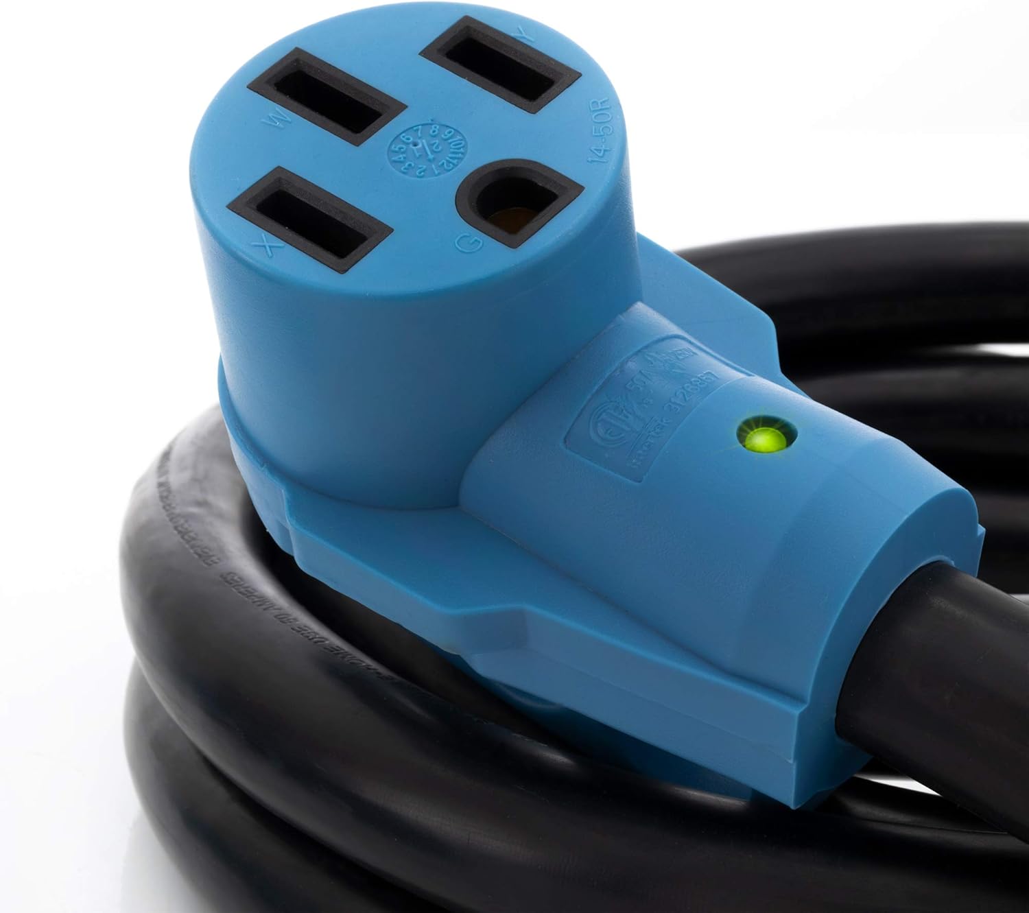 Details:50AMP RV Extension CordNEMA 14-50P(male) & NEMA 14-50R(female)Wire gauge: 6/3 + 8/1 | 3 wires @ 6Ga, 1 wire @8GaOptions for 15’, 30’, and 50’ lengthsIncludes lighted indicator to show whether electricity is flowing through the cordIncludes organizer loop to keep the cord from becoming tangledEach outlet includes a hook that makes removal easier125/250VAC