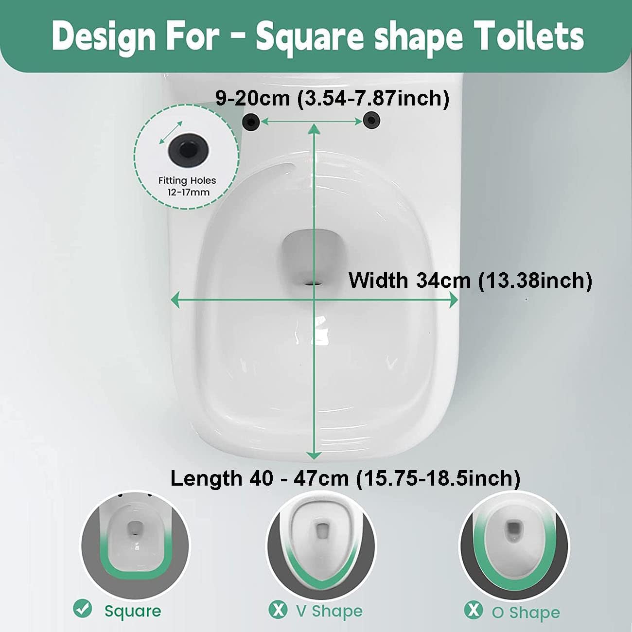 Soft Close Toilet Lidthe Soft Close Toilet Seat Can Close Very Gently and Silently and Prevent the Lid from Slamming to Ensure That Not Disturb Others from the Dream.Button Quick Release Toilet Seatsthe Toilet Seat is Equipped with Adjustable Quick Release Hinge Parts, Which Can Be Quickly Removed from the Top Without Tools. Easy to Clean. It is Recommended to Clean Toilet Seats with a Damp Cloth, Mild Soap and Water to Maintain the Shine for Years.Adjustable HingesAdjustable Toilet Seat Hinges, 360-Degree Swivel Fit, Compatible with Most Toilet Bowls, Easy to Install.No More WiggleNo Need to Be Troubled by Seat Wobbling, Shifting, or Slipping, 4 Bumpers Evenly Distribute Weight, Your Seat Will Never Come Loose.Easy to InstallEasy Installation with the Included Mounting Hardware.Product Information:Item Name: Rounded Square Toilet SeatMaterial: PpLoad Capacity: 150 Kg / 330 LbsInstallation Size: 43.5X34Cm / 17.1X13.4InInstallation Hole Distance: 9-20Cm / 3.5-7.9InAdjustable Length: 40-47Cm / 15.7-18.5InPackage Contents:1 X Slow Close Toilet Seat1 X Accessory Bag1 X InstructionsFriendly Tips: