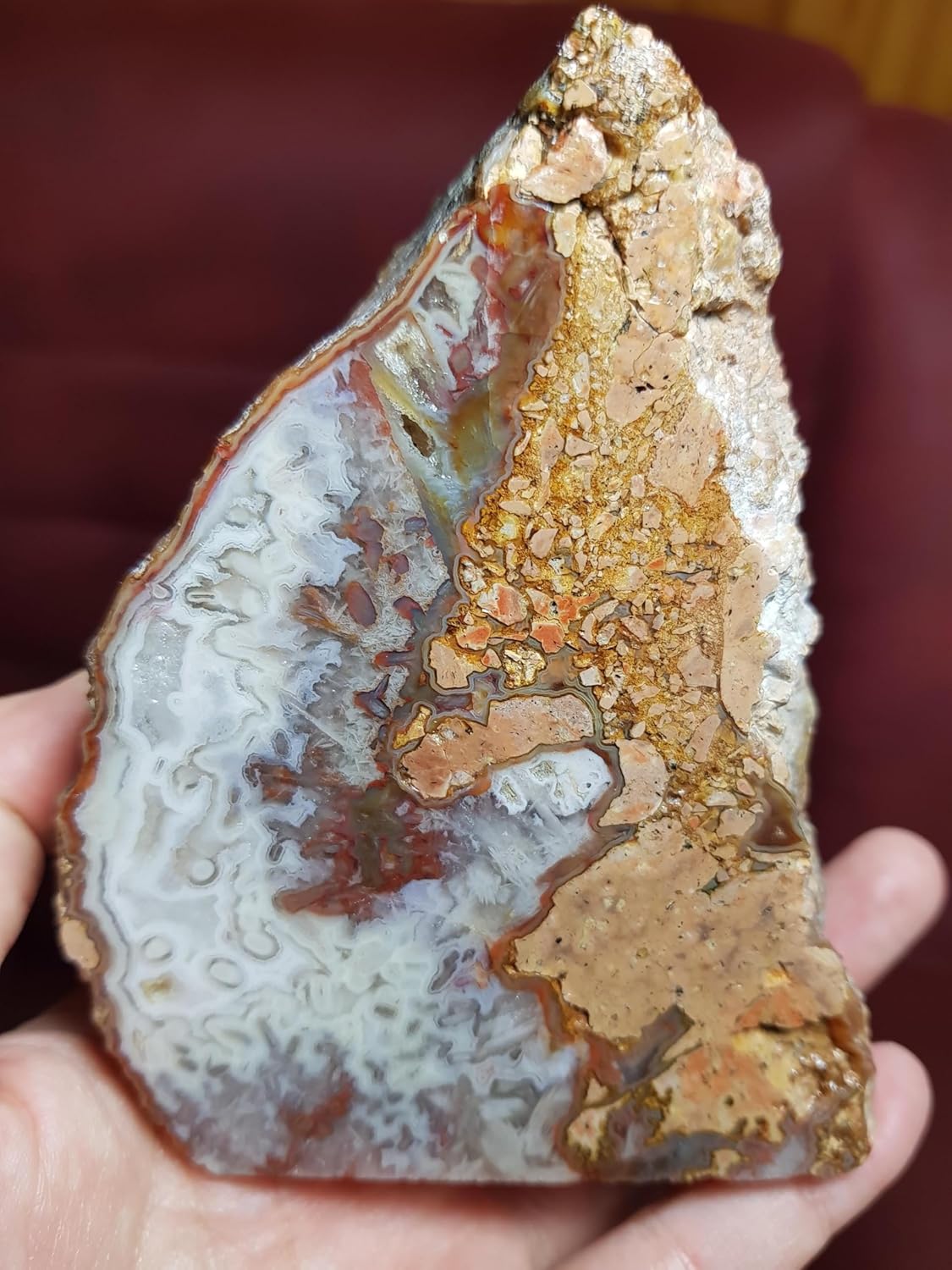 Weight: 406g Polished Red and White Agate Slice | Unique Banded Agate Geode | Crystal for Creativity and Strength | Single-Cut Collector's Piece This striking, hand-polished slice of banded agate is a captivating work of natural art. The single-cut piece features a dynamic interplay of rich, earthy tones, with mesmerizing bands of deep red, rust, and pristine milky white. The patterns swirl and flow, creating a visual symphony of color and texture that is both grounding and energizing. The polished face reveals the intricate details and smooth finish. This is a truly one-of-a-kind piece for any crystal lover or collector. Metaphysical Properties: This agate is a powerful stone of balance and inner strength. The vibrant red bands are believed to stimulate the Root Chakra, providing a strong sense of grounding, stability, and courage. The soft white layers are associated with the Crown Chakra, promoting clarity, purity of thought, and spiritual connection. Together, these energies create a harmonious balance of stability and creative insight, helping to fuel your passions while keeping you centered and secure. It is an excellent stone for those seeking to overcome adversity and manifest their goals with resilience and focus. Ideal for Professions Like: Creatives and Writers: The combination of grounded energy and creative stimulation can help artists and writers find both inspiration and the discipline to complete their work. Therapists and Counselors: This stone's balancing properties are excellent for maintaining emotional stability and a clear mind while helping others. Students and Researchers: Its ability to promote focus and clarity makes it a great companion for study sessions and deep thought. This unique red and white banded agate slice is a perfect centerpiece for your home, a powerful addition to your meditation practice, or a thoughtful gift for someone special.