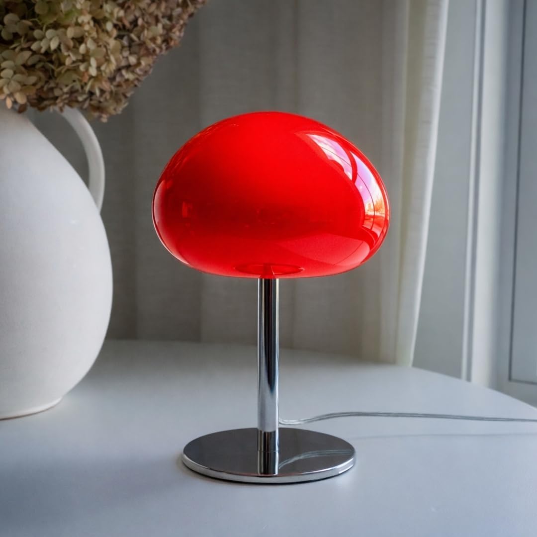 Bold, retro, and impossible to ignore — this red glass mushroom lamp brings instant wow to any room. With its glossy dome shade, rich ruby-red glow, and dimmable warm lighting, it turns any corner into a cozy, feel-good vibe zone. Whether you’re styling a nightstand, decorating your bedroom, upgrading your desk setup, or adding a pop of color to your living room, this small-but-mighty 13.5” lamp steals the spotlight in the best way. Its vibrant retro silhouette mixes 70s charm with modern aesthetic décor, creating a warm ambient glow that feels artistic, inviting, and totally unique. Perfect for bedrooms, apartments, dorms, reading nooks, and anyone who loves colorful statement lighting — this red glass table lamp is the mood-setter you didn’t know you needed.