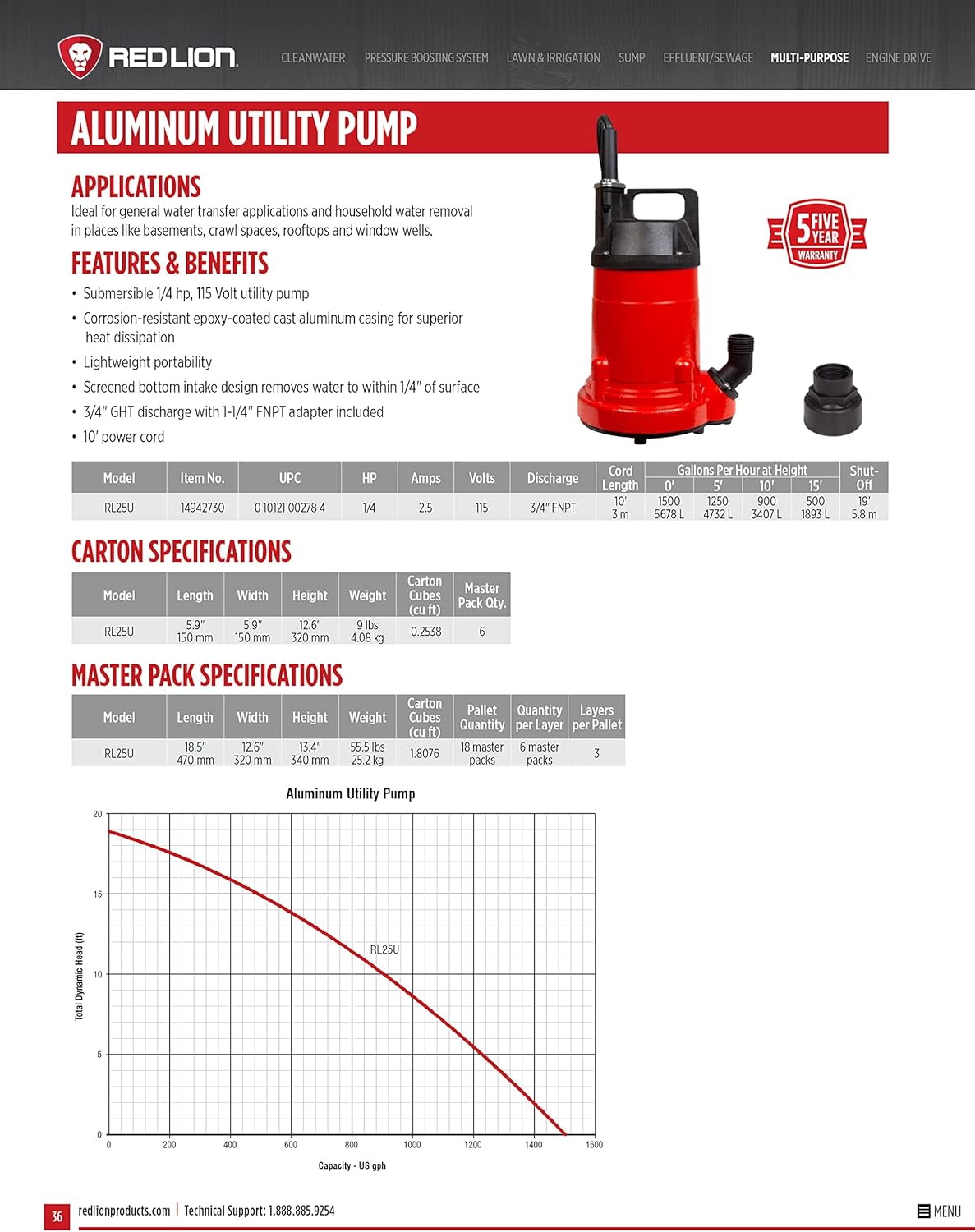 The Red Lion RL25U is a submersible, manual, 1/4 HP, 115-Volt aluminum utility pump capable of delivering up to 1500 GPH. Ideal for water transfer or removal in and around the home including flood water removal. It comes equipped with a 3/4-inch garden hose discharge and a 1-1/4-inch FNPT adapter. This pump is equipped with a 10-ft. power cord.