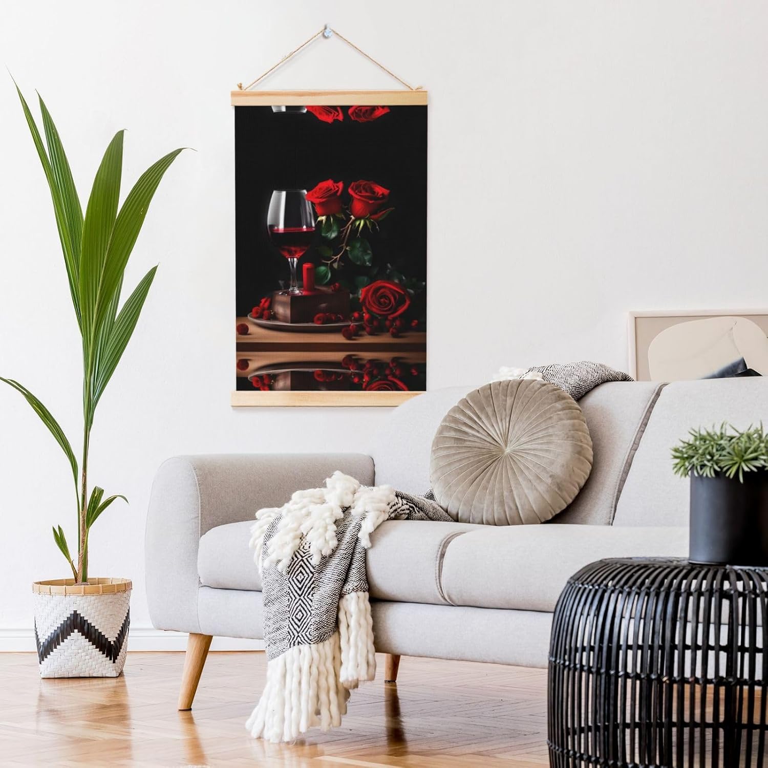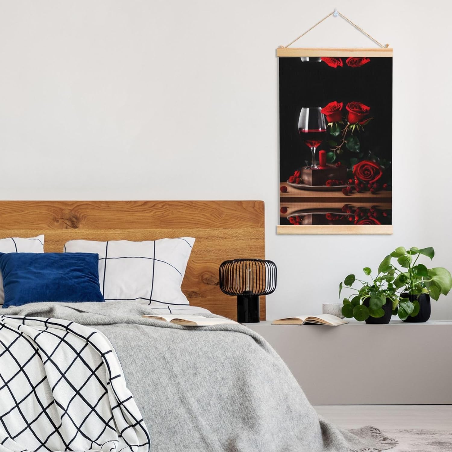Red Rose And Wine Romantic Lovers Decor Print Poster Hanger,Hanging Poster, Poster Frame,Wood Poster Hanger, For Wall Hanging