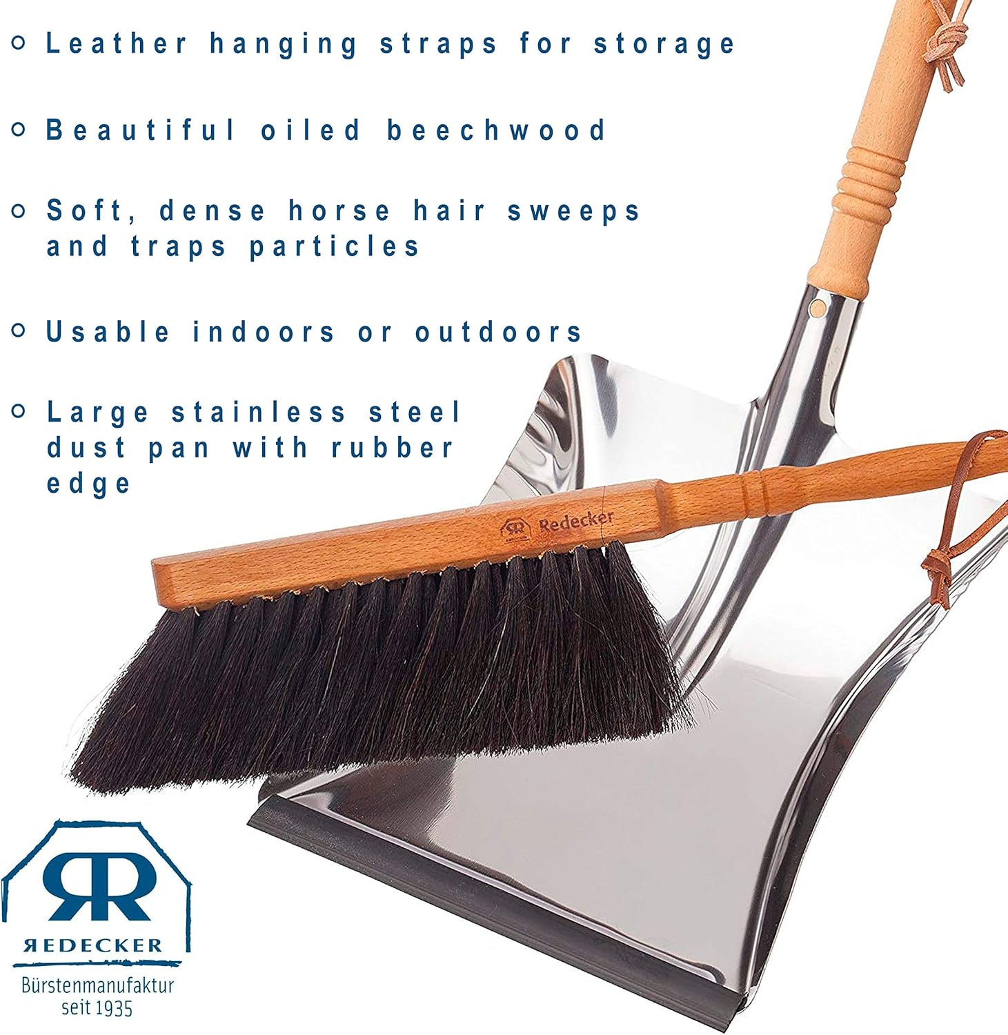 Introducing the REDECKER Horsehair Fiber Hand Brush and Dust Pan Set, a dependable and durable solution for both home and outdoor cleaning. This broom with dustpan combo set made in Germany exemplifies quality craftsmanship with its robust beechwood and stainless steel construction, designed to endure years of rigorous use. The benefits of this outdoor dustpan and brush set are manifold. The dense horsehair broom effectively picks up even the smallest particles, making it an ideal choice for indoor sweeping. The extra-long handle of the steel dust pan ensures a comfortable sweep experience, while its large capacity reduces the frequency of emptying, thus enhancing cleaning efficiency. This standing wood and steel dustpan and brush set addresses the common issue of inefficient sweeping tools that fail to capture fine dust and debris. Whether you are sweeping pet hair off the living room floor or tidying up the kitchen, this outdoor dust pan and brush set offer a thorough and effortless cleaning experience. Unique features of this REDECKER wooden broom and dustpan set include its hanging loops for easy storage, a feature often absent in similar broom and dust pan sets. Additionally, the high-quality horsehair brush ensures superior dust and dirt collection compared to synthetic alternatives. For care and maintenance, simply shake out the brush and rinse the dustpan when necessary. This wooden dustpan and brush set does not include additional accessories, focusing solely on delivering a premium cleaning tool that meets all your household needs.