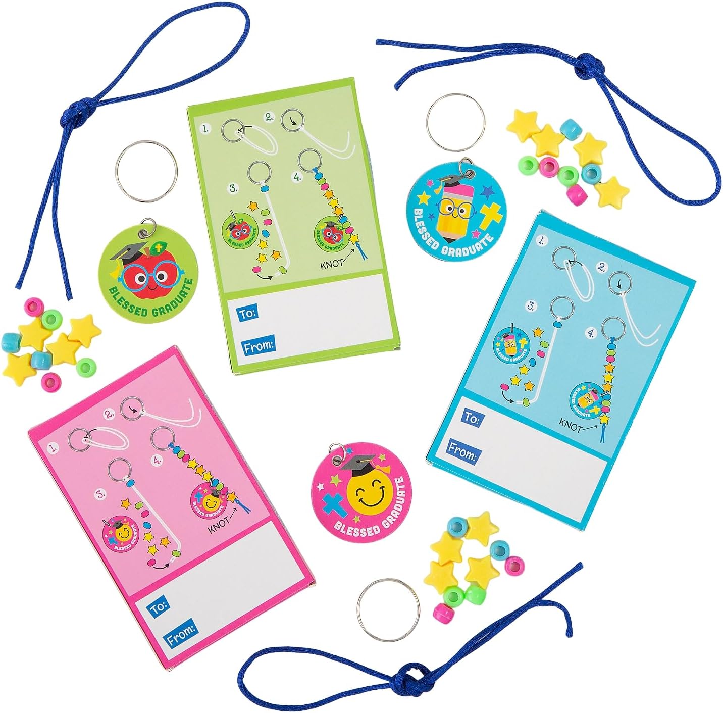 Mark the moment with a craft they can wear with pride! This Religious Elementary Graduation Keychain Craft Kit Handout pairs a giftable cardstock box with To/From and uplifting religious text with a kid-assembled keychain that reads “Blessed Graduate.” The set comes in three assorted designs (apple, smiley face, pencil—all in grad caps). Each unit is individually packaged with beads, charm, ring, and cord so leaders can hand them out fast. Finished keychain length is about 5"; gift box measures 2.5" x 4". Set makes 12.