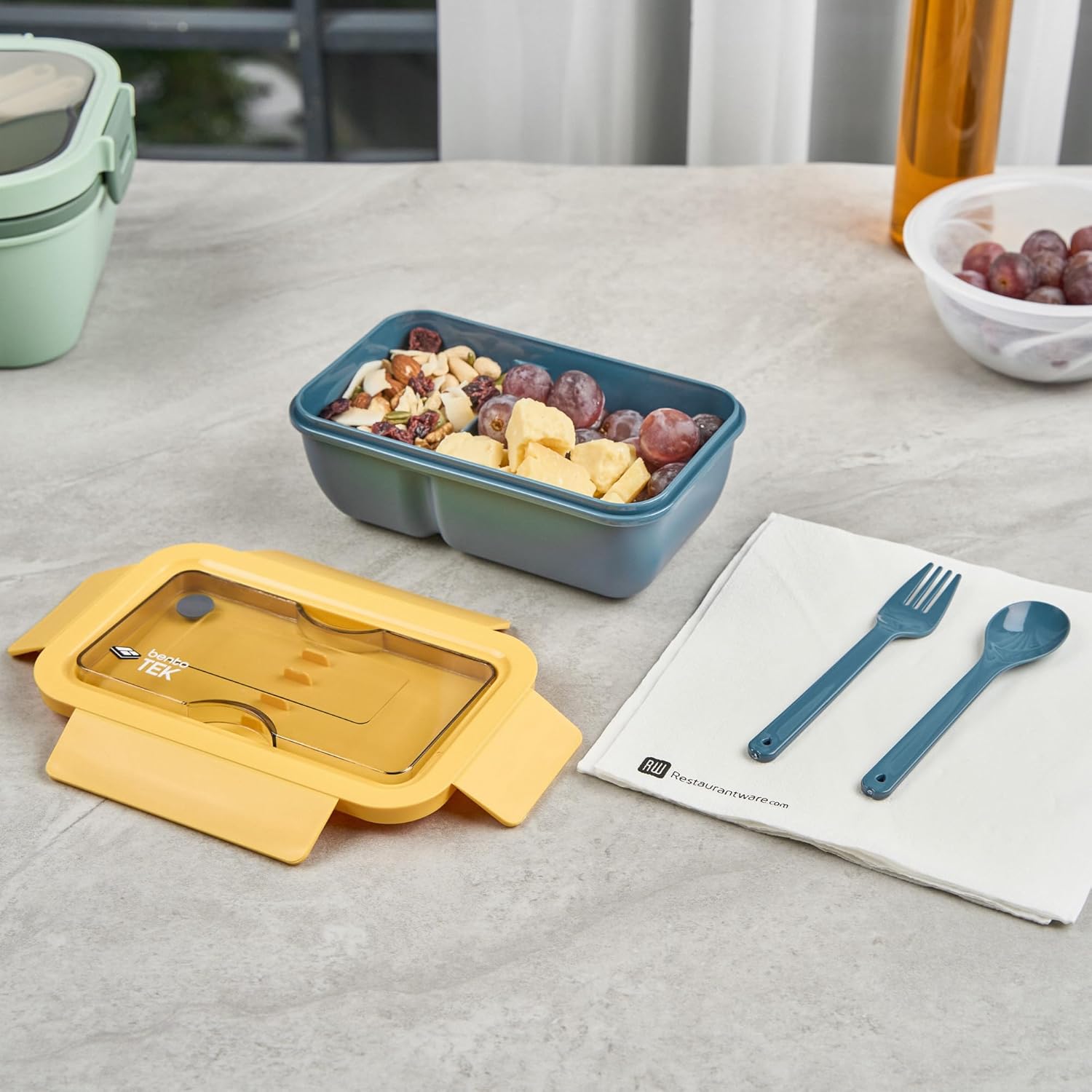 Elevate your meal management with our Bento Tek 28.7-Ounce Blue and Yellow Lunch Boxes. Constructed from plastic that does not contain BPA, these bento lunch boxes offer reliable choices for your food storage needs. These lunch boxes include plastic forks and spoons, providing the necessary cutlery for sophisticated eating experiences. To easily reheat your meals, these bento boxes are designed to be microwavable, providing convenient and efficient ways to enjoy warm and delicious food. These lunch containers have leakproof snap-on lids with silicone seals to reduce spills while taking your meals to work. Dishwashable, these meal prep containers offer easy cleanups after your meals, reducing the hassles of hand washing. These plastic lunch boxes are designed to be odorless to maintain the freshness of your food. Holding up to 28.7 ounces, these Japanese bento boxes provide ample space to pack your culinary delights. The vibrant blue and yellow design of these plastic lunch containers adds playful touches to your lunchtimes. To preserve the freshness of your lunches, these food containers are freezable. These meal prep containers measure 7.7 inches in length by 4.7 inches in width by 2.8 inches in height and can hold up to 28.7 ounces each. Sold in a 10 count box.