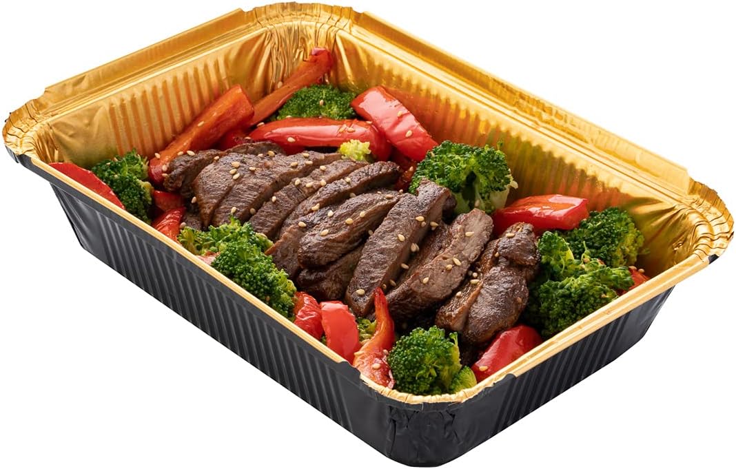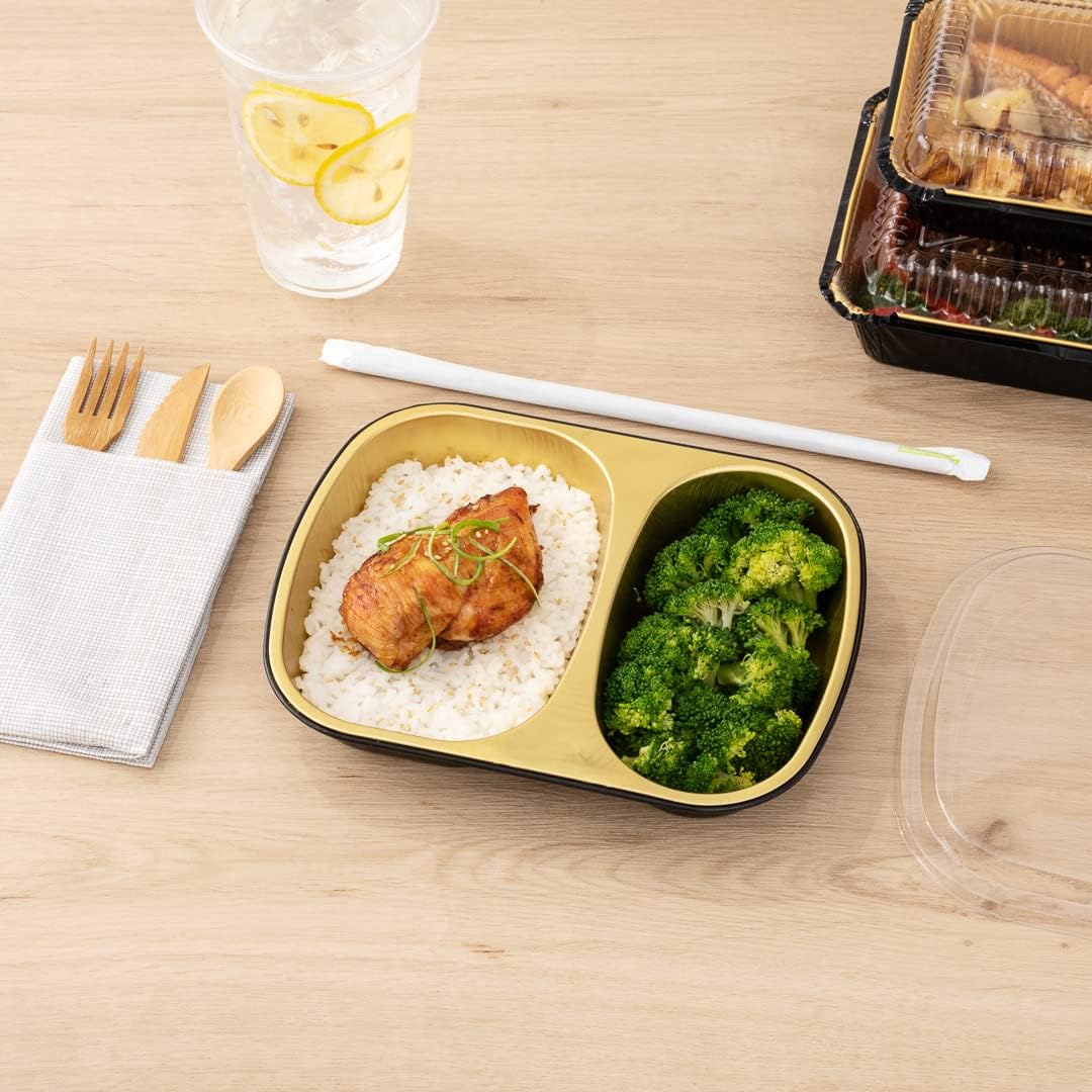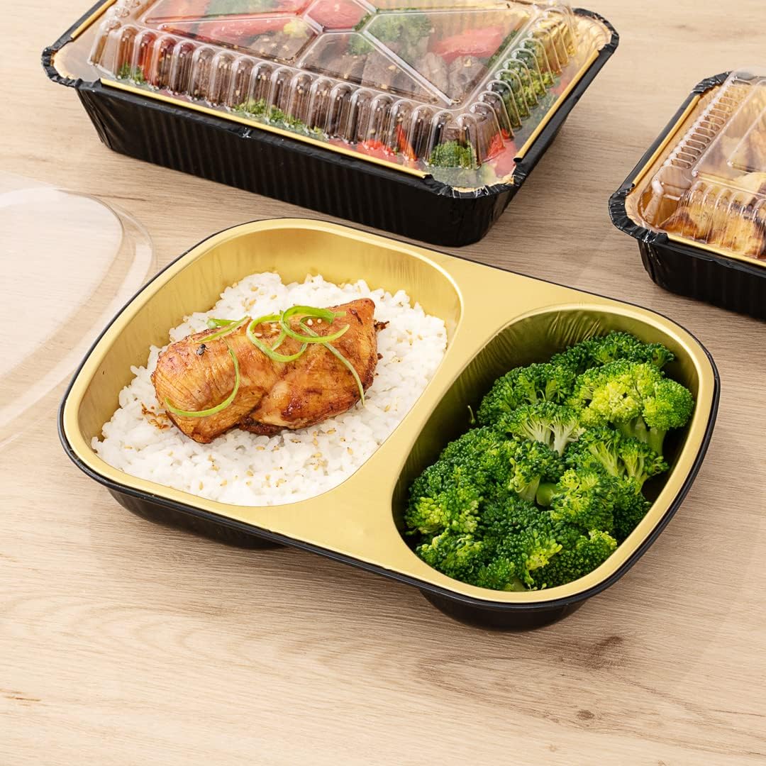 Streamline meal prep with elegant and functional packaging. The Foil Lux Dual-Compartment Foil Takeout Container features a versatile 2-compartment design ideal for packing entrees and sides together, enhancing operational efficiency. Made from premium aluminum, this foil takeout container is perfect for baking meals in the oven and storing desserts in the freezer, giving caterers and chefs reliable versatility. The gold interior and black exterior elevate food presentations, providing a sophisticated look for upscale events. Measuring 8.9 inches by 7 inches, this disposable foil pan offers a spacious 28.3-ounce capacity, making it optimal for a variety of culinary creations. Its greaseproof design ensures easy cleanup, while being oven safe and freezer-safe adds to its practicality in busy kitchens. Each order includes 100 Foil Lux Dual-Compartment Foil Takeout Containers.