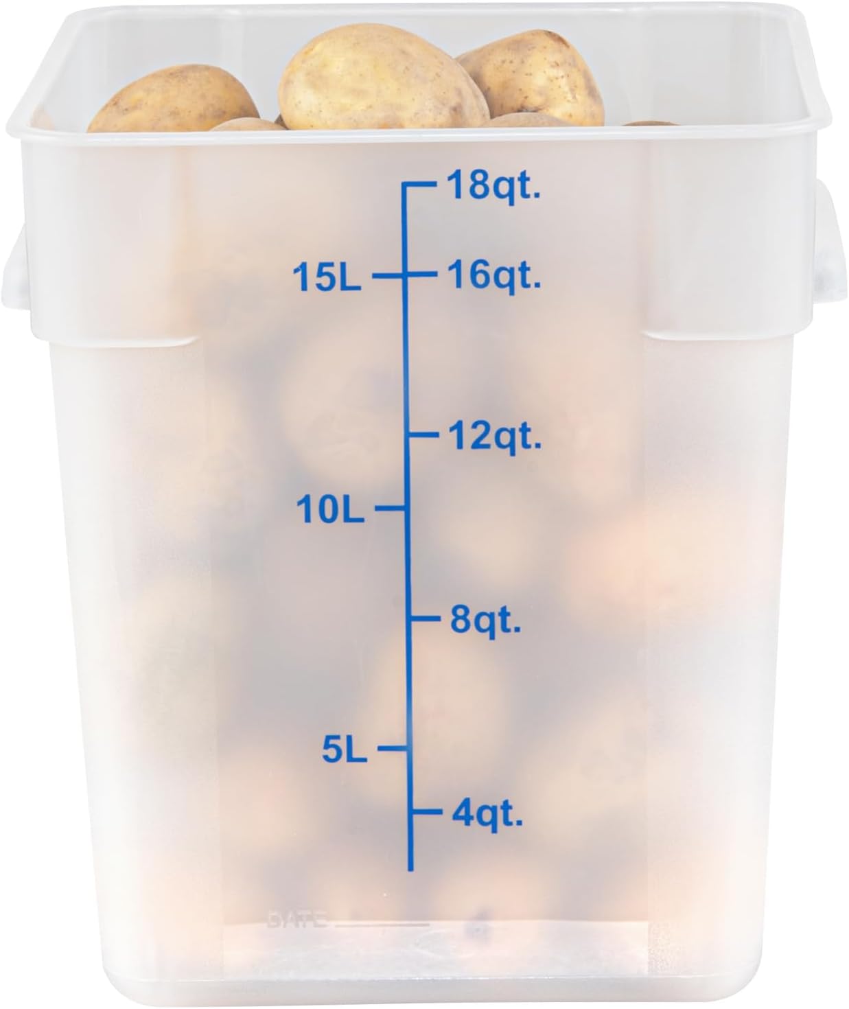 The Met Lux Portion-Control Square Food Container – Spill-Minimizing, Space-Efficient – 10.9" x 10.9" x 12.5" – 1 Count Box is expertly designed to enhance food storage efficiency in any busy kitchen. This square food container combines a smart, stackable design with an airtight storage feature, making it ideal for organizing cold and hot food storage without compromising on space. Constructed from durable polypropylene, this translucent storage container boasts an 18-quart capacity, perfect for large-scale foodservice operations. The blue graduations on the container enable precise portion control, helping to minimize waste, while the stable handles ensure effortless transport and reduce the risk of spills. As a dishwasher safe container, it offers convenient cleaning, and its freezer safe storage capability ensures versatility for various kitchen needs. This durable plastic container is a reliable choice for chefs and restaurant owners aiming for organized and efficient kitchen storage solutions. Each order includes 1 pieces.