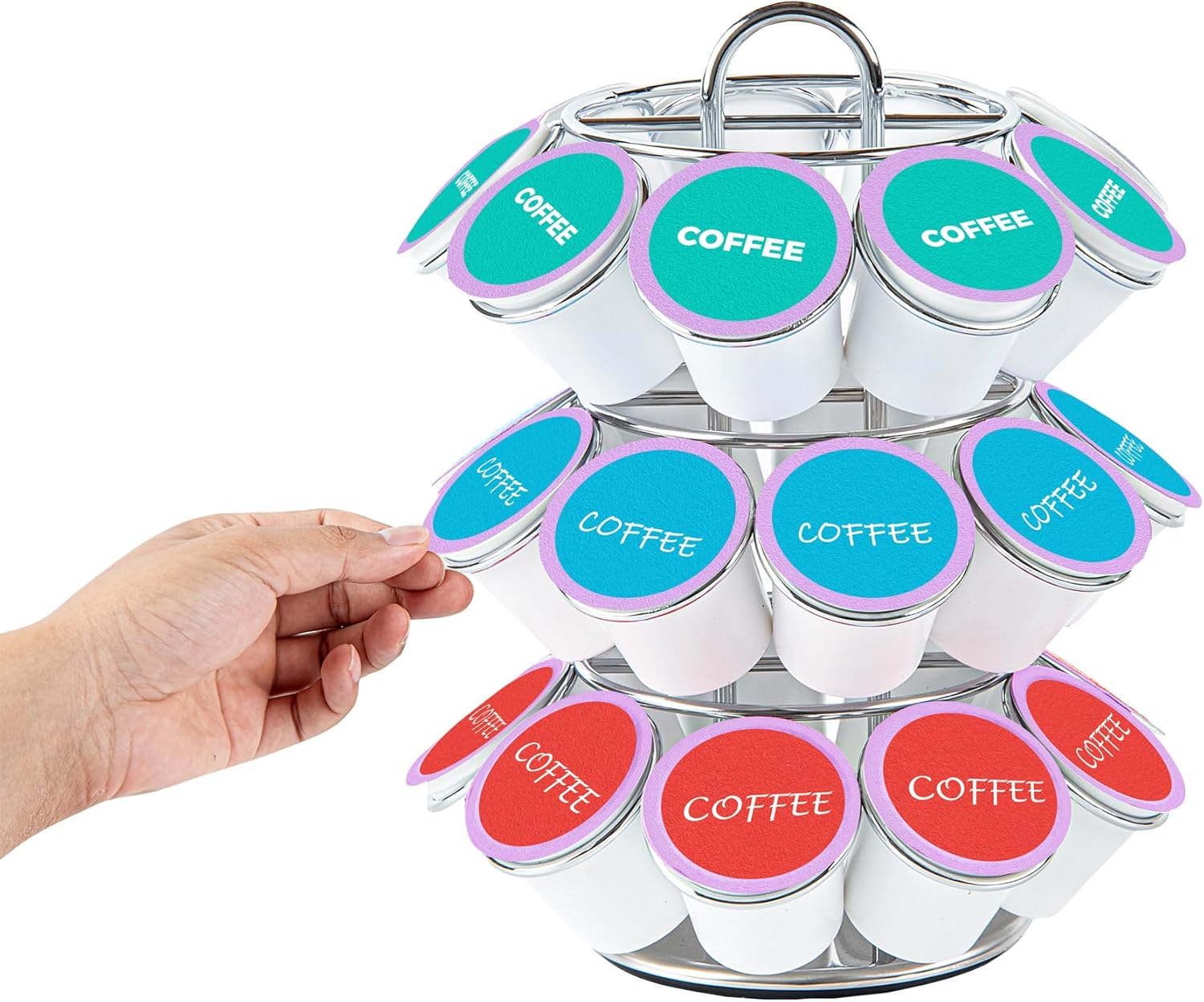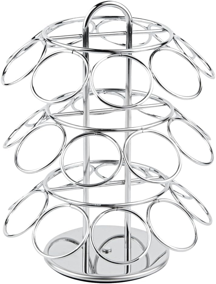 Elevate your coffee station with efficient pod organization. The Restpresso Revolving High Capacity Coffee Pod Holder streamlines operations with its 360-degree rotating base, allowing baristas to swiftly select pods, enhancing service speed. This coffee capsule organizer holds up to 27 pods, maximizing storage in compact areas like bustling cafes or hotel breakfast buffets. Built with sturdy iron construction, this rotating coffee pod rack withstands the demands of busy settings, offering long-lasting use and reliability. With compact dimensions of 6.69 inches by 6.69 inches by 8.66 inches, it fits neatly on countertops, maintaining an organized and aesthetically pleasing beverage station. Its sleek, professional appearance adds a touch of elegance to any setting, making it a must-have for restaurants and offices aiming for a polished look. Enhance your coffee service setup today. Each order includes 1 Restpresso Revolving High Capacity Coffee Pod Holder.