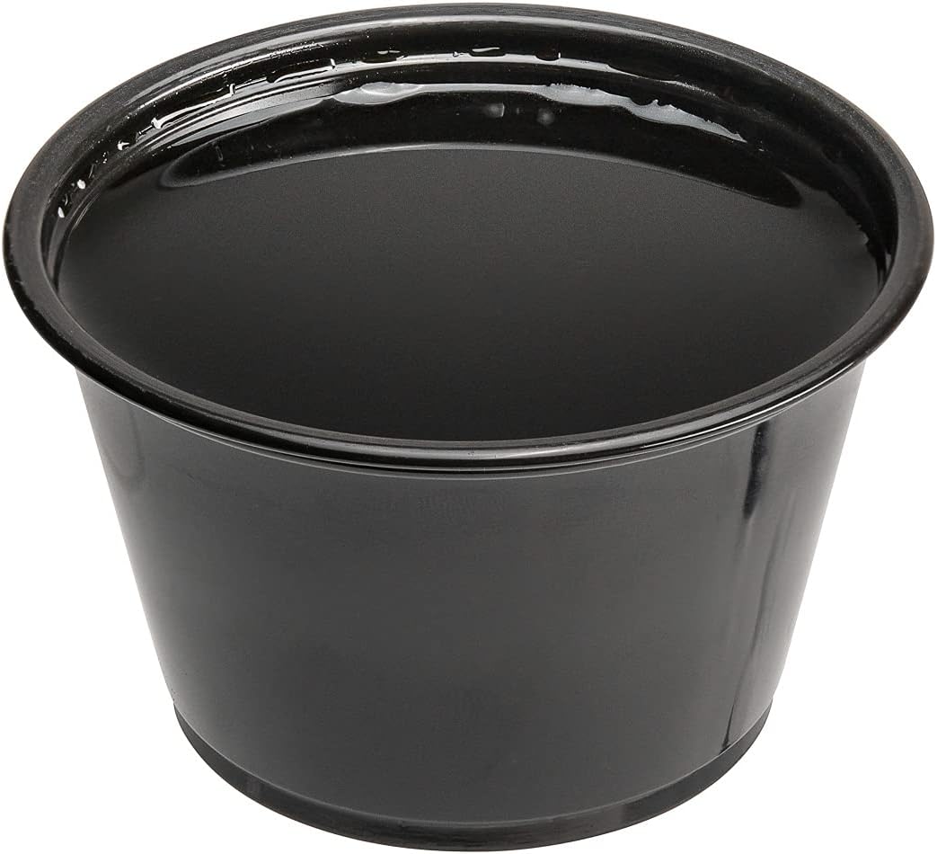 Serve ketchup and mustard alongside fries using our Chef 101 1-ounce Round Black Plastic Portion Cups. Crafted with high-quality plastic, these condiment cups are recyclable for an eco-friendly and efficient way to dispose of cups after use. Conveniently microwave-safe, these plastic condiment cups allow you to reheat sauces or dips. These 1-ounce cups feature a rolled rim that prevents sauces from overflowing when filling up cups. To securely package condiments for delivery orders, pair these plastic condiment cups with our coordinating clear lids (SKU: RWP0620C). The black finish of these condiment cups perfectly complements the packaging and serving supplies at your restaurant, cafe, or bar. Great for space-saving storage, these plastic condiment cups can be easily stacked together. These condiments cups hold up to 1 ounce and measure 1.7 inches in diameter by 1.3 inches in height. Shipped in a 2000 count box. Lids available and sold separately.