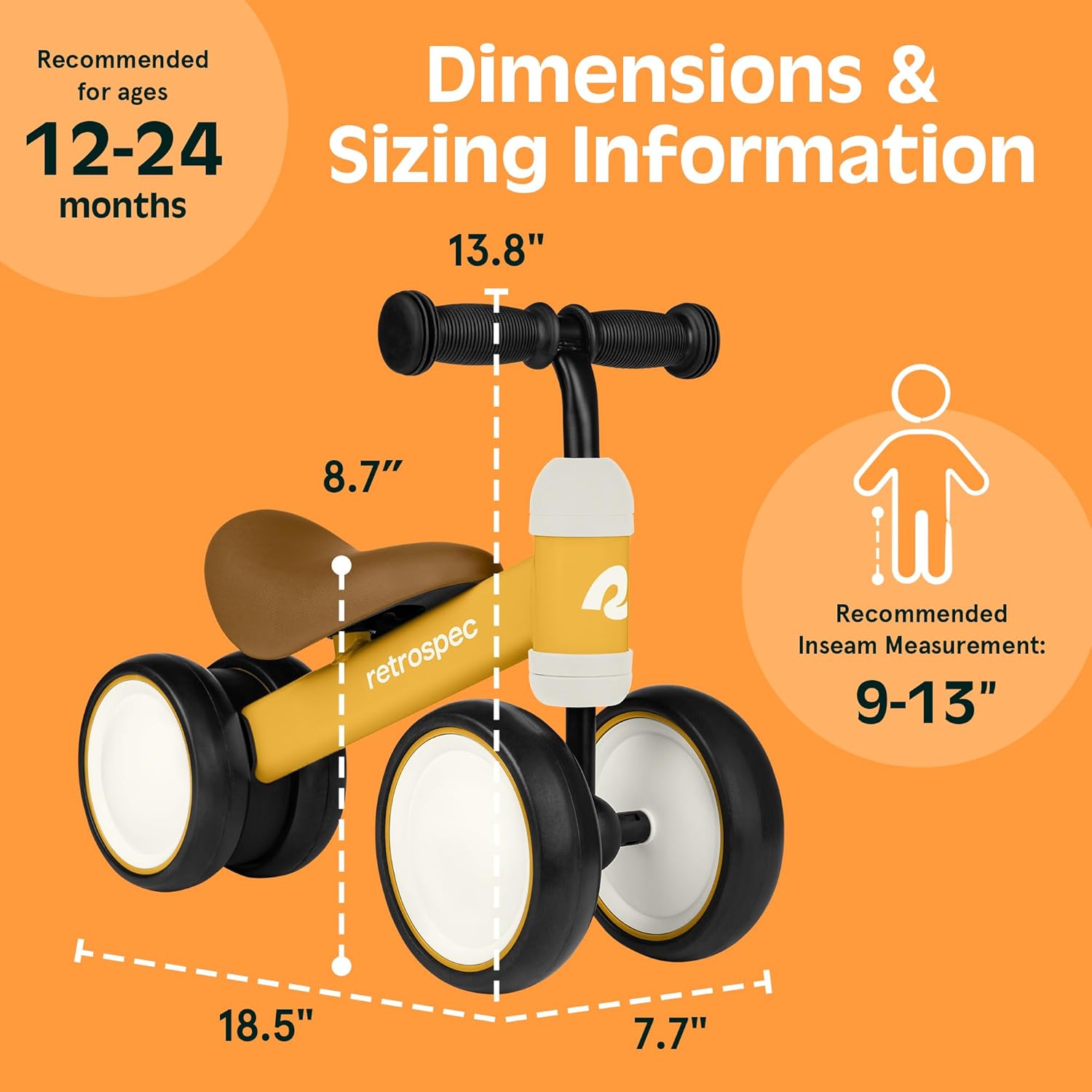 Meet Cricket, Retrospec’s baby balance bike and ride-on toy designed for budding riders ages 12–24 months. This beginner balance bike helps toddlers practice balance, steering, and coordination while building confidence from their very first ride. With four stable wheels, rounded components, and soft, no-scratch tires, Cricket is designed to be difficult to tip and gentle on indoor floors. Its low, feet-to-floor design lets little ones push, scoot, and glide at their own pace indoors or outdoors, without pedals or training wheels getting in the way. Lightweight and easy for parents to carry to the park, playdates, or grandparents’ house, it’s an ideal first bike and a thoughtful first birthday gift for 1-year-old boys and girls. Focused on balance and confidence over flashy distractions, Cricket helps make the transition to a big-kid bike smoother and more natural.